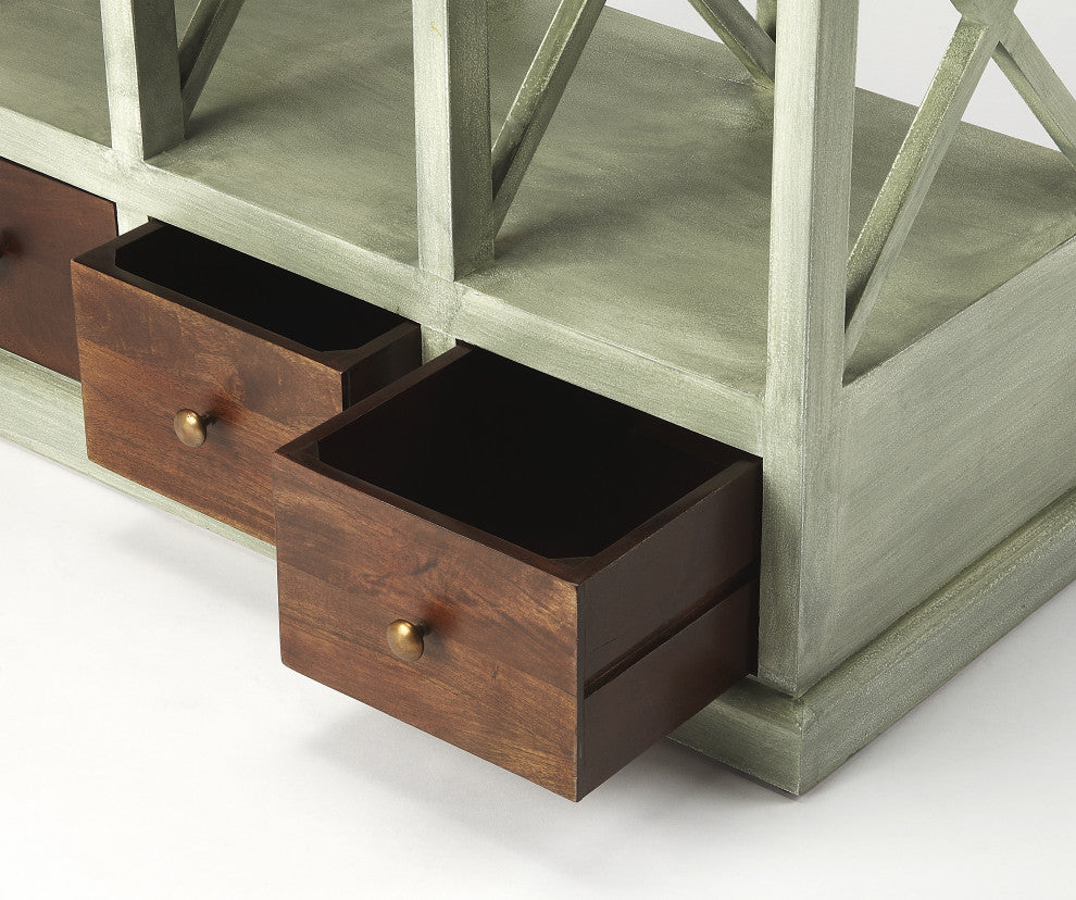 Boldly combining brown wood tones on the drawer fronts with a gray driftwood patina overall gives this table a compelling sophistication " distressed and antiqued. Crafted from mango wood solids and wood products, the table offers substantial storage and display space.