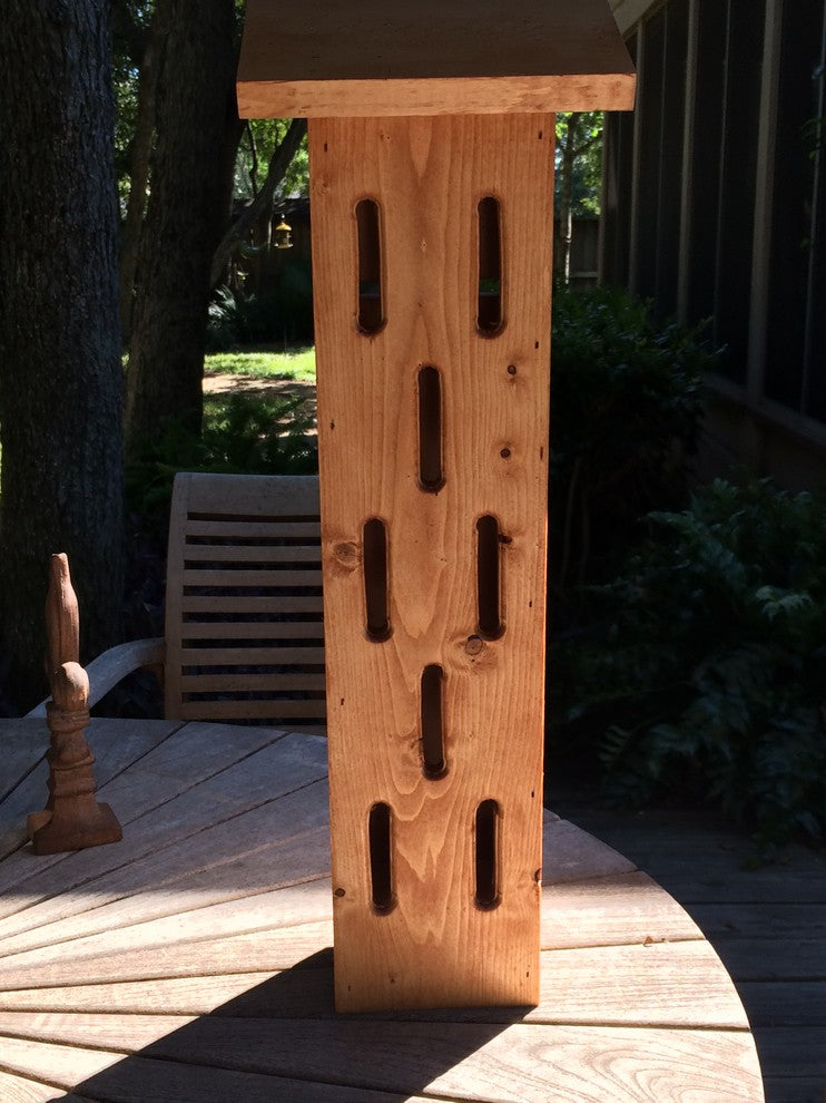 This Butterfly house provides a safe resting place on the bark strips from predators when set among the flowers. It is ventilated and has a back door that opens and closes for easy cleaning. It has been handcrafted with high grade southern pine, Each house is unique in their own way. Stain available in Cherry, Walnut or Golden Pecan. Bark and pole included. This is our best seller!!! Made in the USA.