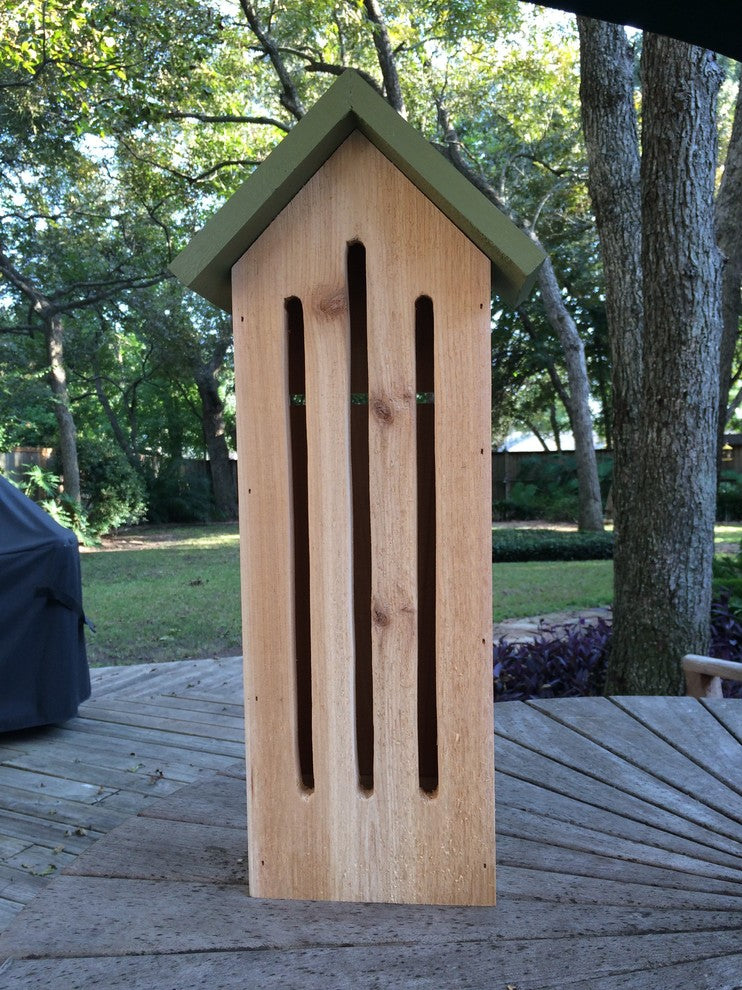 This Butterfly house provides a safe resting place on the bark strips from predators when set among the flowers. It has been handcrafted with premium cedar wood, each house is unique in their own way. Also comes in natural, red or yellow roof. Built for functionality with ventilation, and a back door that opens and closes for easy cleaning. Bark and pole included. This is our best seller!!! Made in the USA.