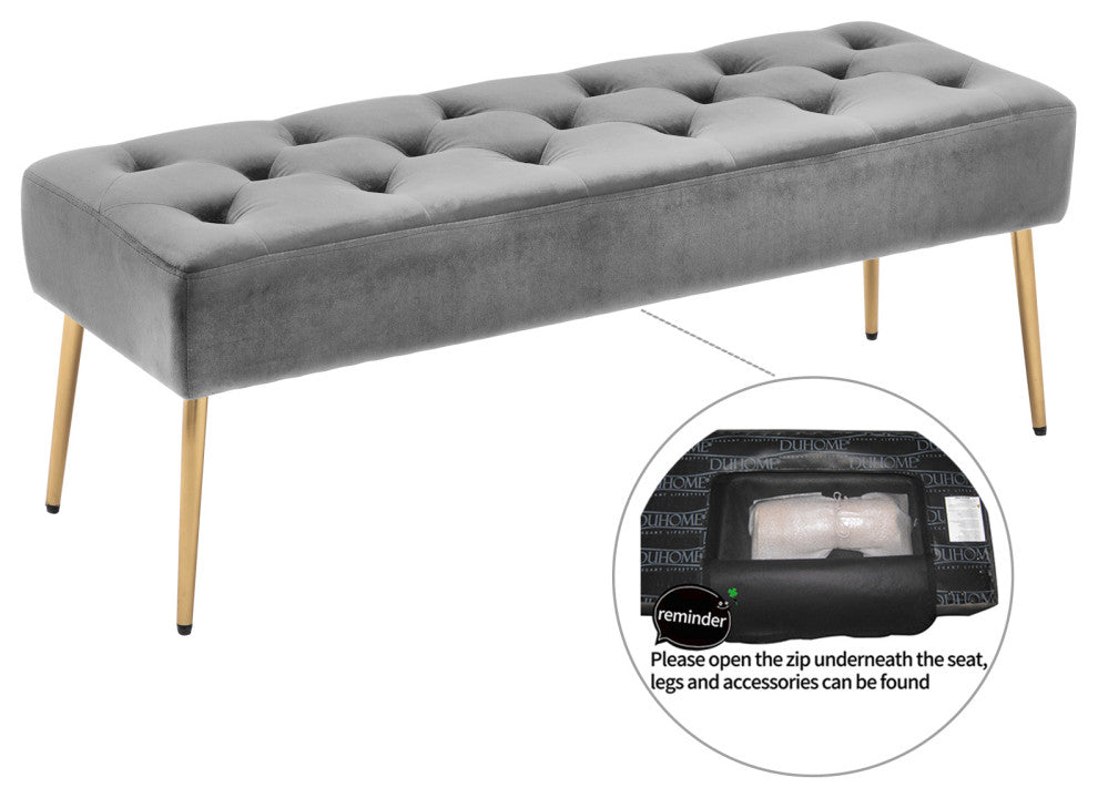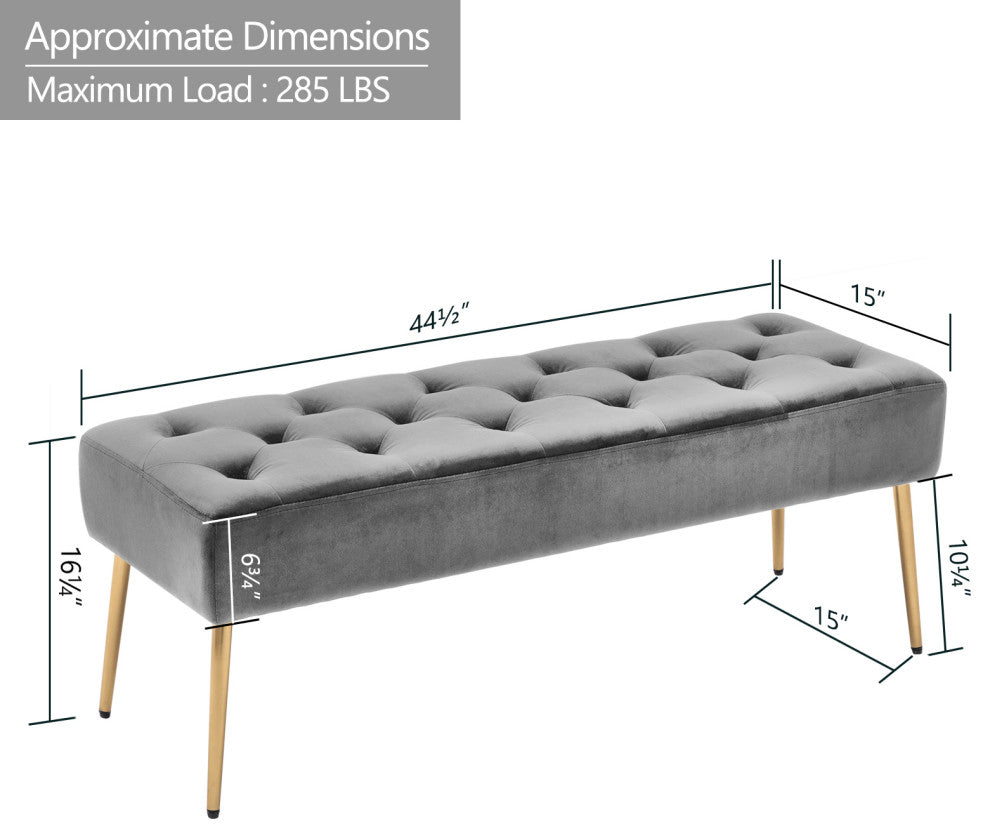 Effortlessly elegant and irresistibly inviting, our Button Tufts Bedroom Bench elicits visions of luxurious lounging. Whether placed at the foot of the bed, in an entryway or hallway, or anchoring a sitting space, our button tufted bench is sure to stand out with its allure. Upholstered in your choice of supple yet durable faux leather, easy-care PU leather or plush velvet fabric, its button-tufted seat embraces you in comfort. High-density foam provides cushioning that yields to your contours yet retains its shape, as the flared black, silver or golden legs give it a glamorous silhouette. A bench that invites you to unwind in stylish solace! Features: • Various Upholstery: Upholstered in a luxe choice of breathable faux leather, durable PU leather or plush velvet; • Black/Silver/Gold Legs: Flared legs, offered in black, silver or golden oak finishes, ground the bench and provide a steady base; • Button Tufted: Button tufting along the surface adds elegant texture and distinction, accentuating the bench''s inviting profile; • Padded Comfort: With supreme comfort, the bench brings lounging luxury and nest-like comfort within reach; • Versatile Piece: Beautifully crafted to suit your every need, our bench makes an impression wherever it''s placed. Specifications: • Includes: One (1) Bench • Upholstery: Faux Leather/Velvet • Legs: Sand-Blasted/Chrome-Finished/Plating Finished Metal • Overall Dimensions: L44.5" x D14.5" x H16.5" • Weight Capacity: 285 lbs