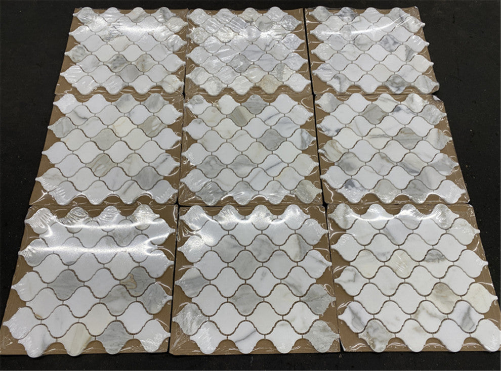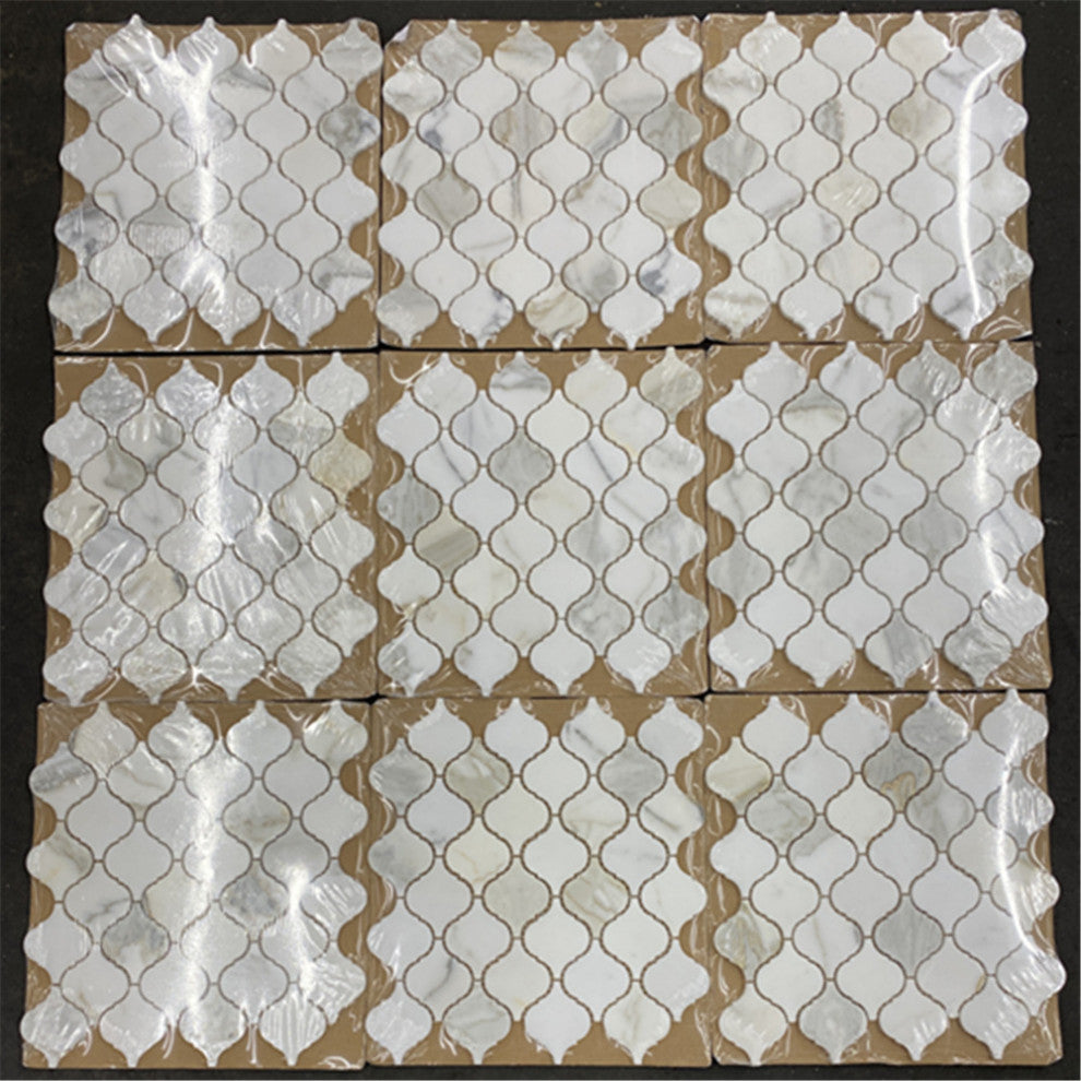 Premium Grade Lantern Shape Arabesque Baroque Calacatta Gold Marble Mosaic Tile. Italian Calacatta Oro Calcutta Gold Borghini Honed Medium Lantern Shape Arabesque Baroque Mosaic Wall and Floor Tiles are perfect for any residential / commercial projects. The Calcutta Gold Borghini Calcatta Borghini Marble Lantern Shape Arabesque Baroque Mosaic Tile can be used for kitchen backsplash, bathroom flooring, shower surround, dining room, entryway, corridor, kitchen backsplash, spa, etc. Our timeless Matte Calacatta Gold Marble Lantern Shape Arabesque Baroque Waterjet Mosaic Tile with a large selection of coordinating products is available and includes hexagon, herringbone, basketweave mosaics, 12x12, 18x18, 24x24, subway tile, moldings, borders, and more.