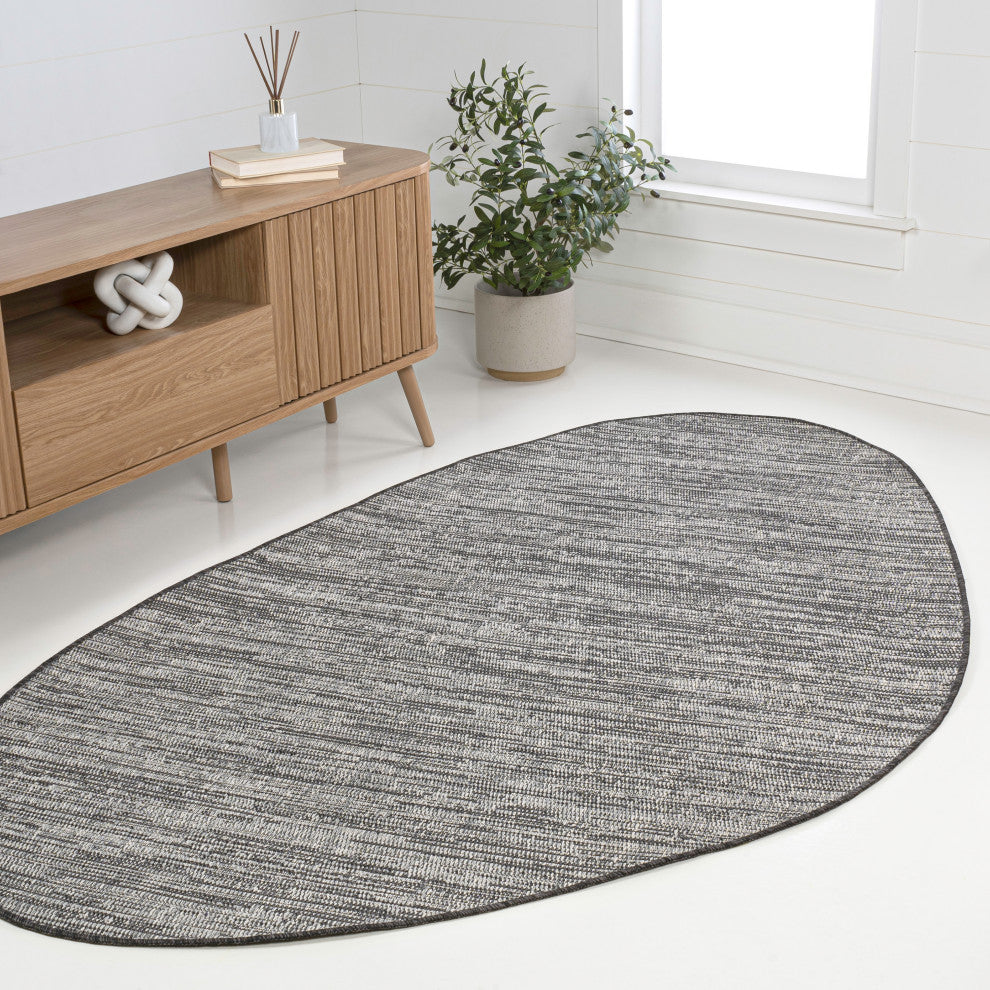 This modern outdoor rug has a minimalist look, with its organic shape and earthy colors. Woven from synthetic fibers, this easy-care rug goes from rustic lodge to urban loft. Use it outdoors on a porch, or in the living room, entry, bedroom or dining room.Features:• Transitional flat-woven design is just 0.19" thick• Woven gray and black fibers are edged in black for a rustic look• Durable woven construction is made from easy-care outdoor polypropylene• 100% Polypropylene• No backing, use of rug pad is recommended (sold separately)• Power Loomed in Turkiye• Actual Dimension: 5 ft. 3 in. x 7 ft. 7 in.• Color: Gray/Black• Thickness measures: 0.19 in.• Available in multiple sizes and/or colorsRug Care:• Vacuum regularly and spot clean as needed; avoid direct and continuous exposure to sunlight; use brushless vacuum; remove spills immediately; if liquid, blot with clean, undyed cloth by pressing firmly around the spill to absorb as much as possible; for hard to remove stains, professional rug cleaning is recommended; store in a dry, well ventilated area and rotate for consistent wear• Packing and shipping may cause temporary creases in rugs, which will flatten out after a week on the floor; to expedite the process, try back-rolling your rug before laying it down, and then allow ample time for the remaining creases to relax• Please Note: Due to differences in monitors, some rug colors may vary slightly. Lengths and widths may vary from the published dimensions. Patterns may vary slightly according to shape and size selected.About us:Style your floors with JONATHAN Y. By combining fine craftsmanship and design, this New York creative studio is bringing fashion to your floors. The collection mixes sustainable organic materials, vibrant colors and trend worthy styles to create JONATHAN Y''s distinctive catalog of rugs.