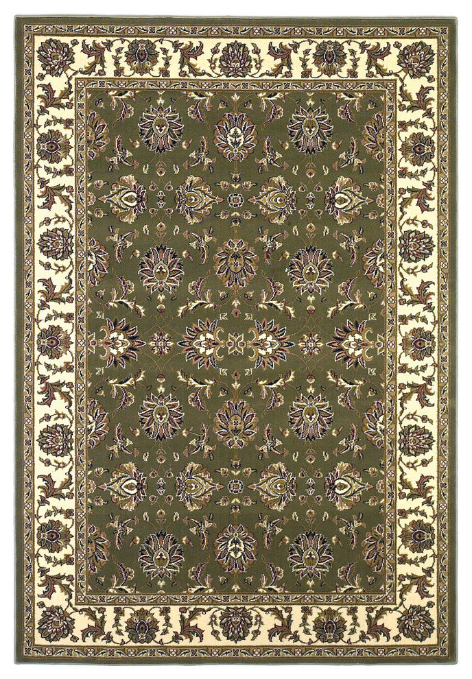 Cambridge 7314 Green/Ivory Kashan 7''7" Round. Machine-Made of 100% Heat-set Polypropelene with No Backing. Made in China. Vacuum regularly & spot clean stains. Professional cleaning recommended periodically.