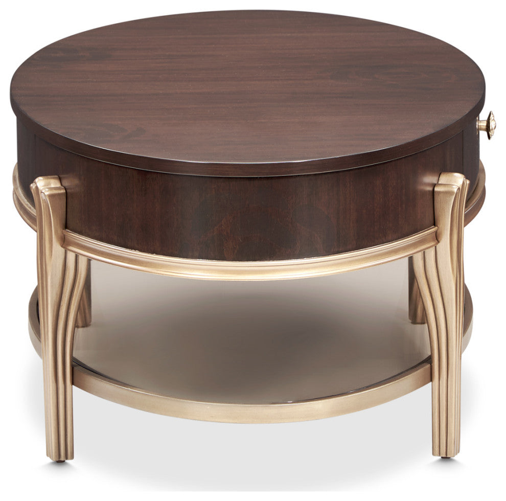 Gather around this centerpiece that is sure to spark conversation. The Camellia Field Cocktail Table combines rich design details with practical features, showcasing a mahogany veneer top in a warm pecan finish and antique gold accents. A velvet-lined drawer with the signature camellia flower knob provides discreet storage, while the tinted glass bottom shelf adds a touch of modern elegance.Velvet-Lined Drawer: A single drawer with luxurious velvet lining, accented by the signature camellia flower knob for added charm.Tinted Glass Shelf: The lower shelf provides an airy, contemporary look while offering additional display space.Mahogany Veneer Top: Warm pecan tones and smooth grains enhance the table"™s refined aesthetic.Camellia Marquetry Design: The tabletop and apron showcase delicate floral patterns, bringing a touch of sophistication to the piece.