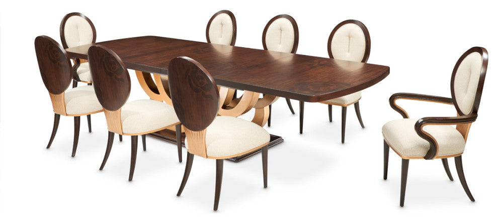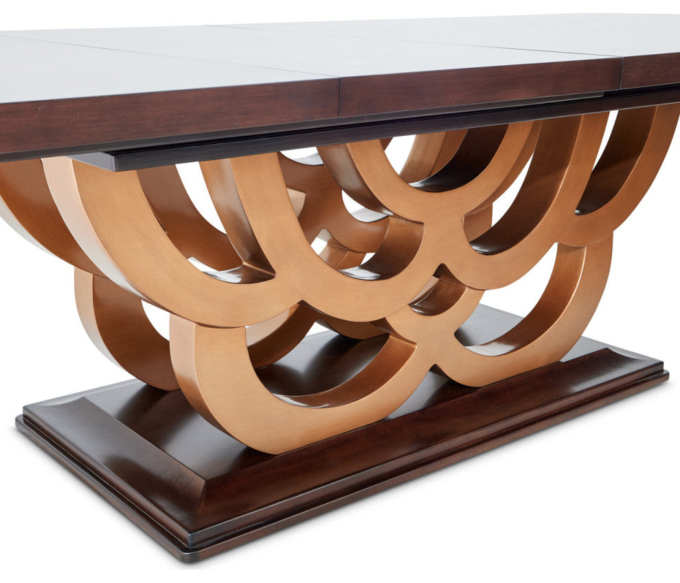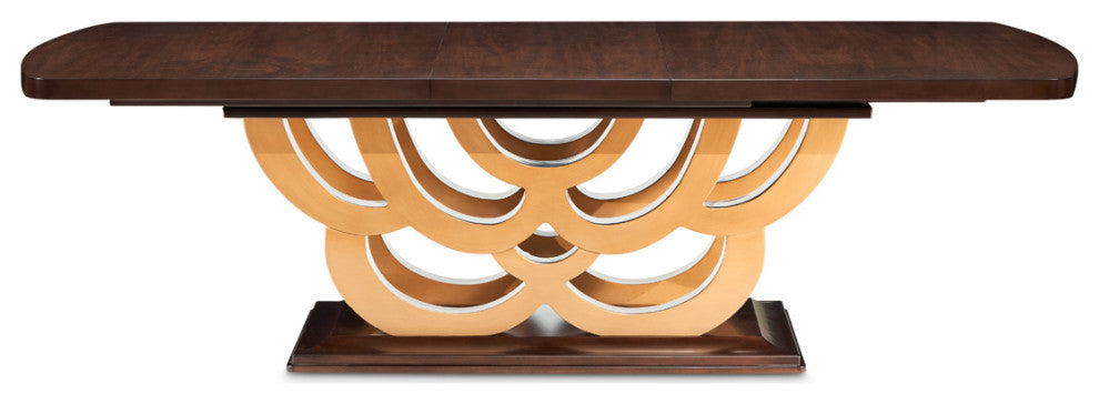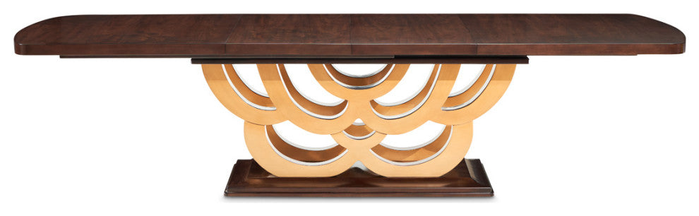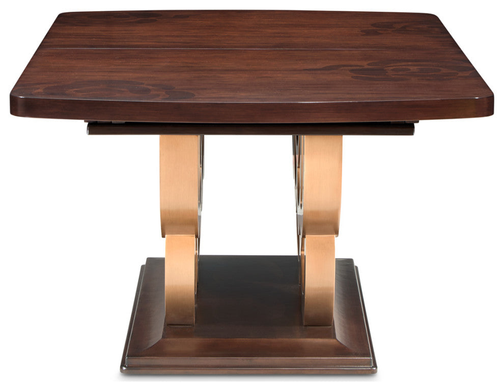 The Camellia Field Rectangular Dining Table brings artistry and versatility to your dining experience. Crafted with a warm pecan mahogany veneer top featuring a subtle camellia marquetry design, this table rests on a striking antique gold pedestal base. Extendable with two 22-inch leaves, it''s perfect for intimate gatherings or larger celebrations, making it the centerpiece of any dining space.