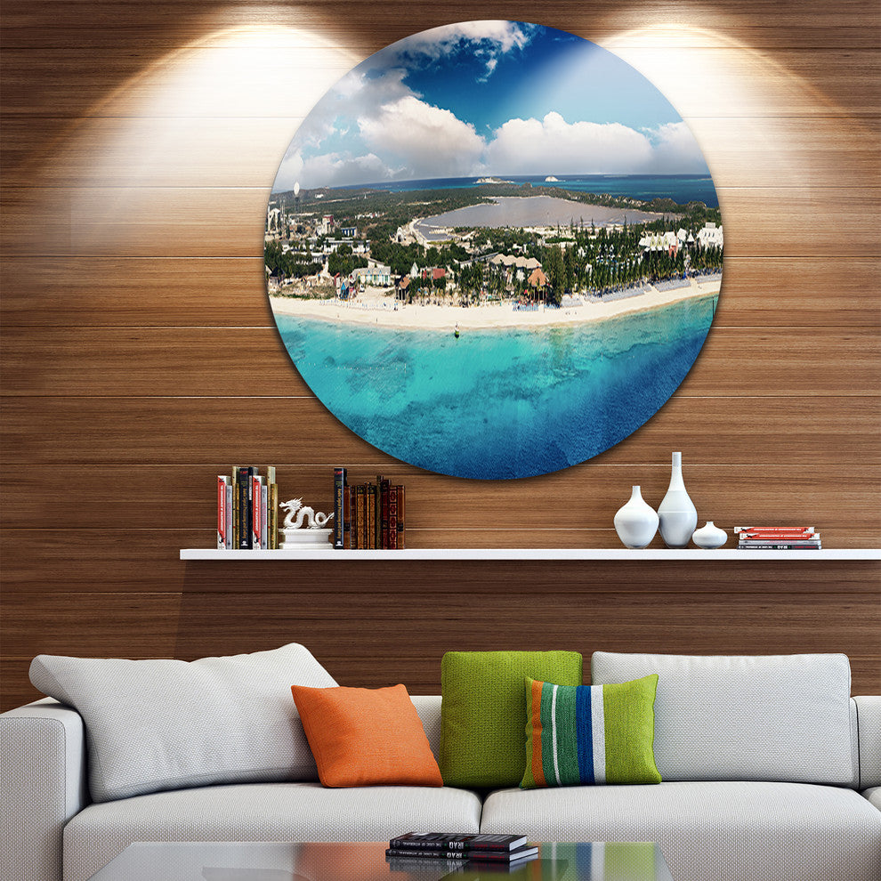 Bring Contemporary Abstraction to your home with this large Circle Metal wall art. This Caribbean Coast Tropical Panorama Metal Artwork makes it the focal point of any room or office.