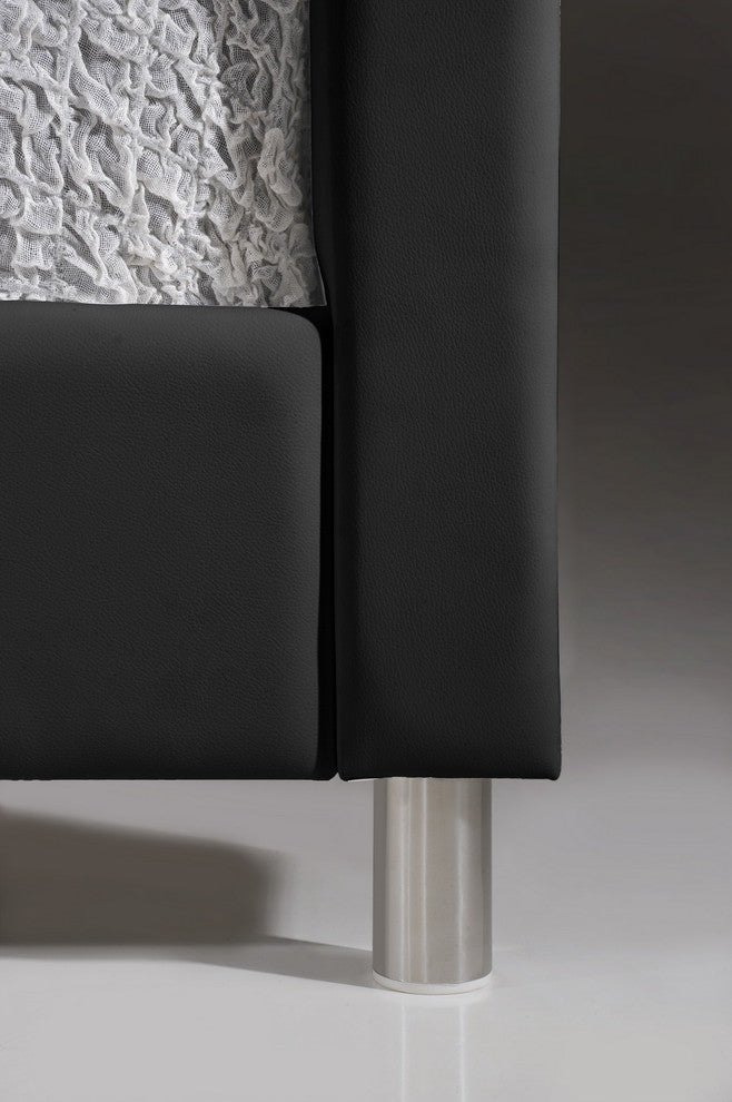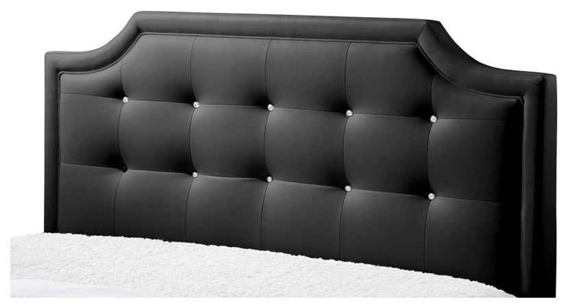 Clean, crisp, and contemporary is the Carlotta Designer Bed frame. Soft black faux leather outfits a scallop-cornered headboard with matching upholstered side rails and low footboard, making this a sleek style for sleeping. Malaysian-made, the full sized Carlotta Contemporary Bed features an inner frame of hardwood and plywood, which are padded with foam before being upholstered. Faux crystals stud the headboard, creating a trendy button tufted look. This is a platform bed: wooden slats (included) serve as a box spring so only a mattress and bed linens are needed (mattress and linens are not included). Tying everything together are silver metal legs with non-marking feet. Easily maintain the Carlotta Bed by wiping clean with a damp cloth as needed. This style requires assembly.