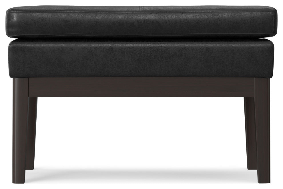 The Carlson Small Ottoman Bench combines timeless craftsmanship with versatile functionality, making it an ideal choice for compact living spaces. Handcrafted with solid pine wood legs in a dark walnut finish, this ottoman features a rectangular silhouette upholstered in distressed black vegan faux leather, offering a rustic charm reminiscent of vintage designs. The padded top provides a comfortable seat or footrest, while its durable faux leather surface resists wear, making it suitable for daily use in living rooms, entryways, or bedrooms. Compact and stylish, the Carlson Ottoman Bench is a practical addition to small apartments or homes, offering a blend of quality, comfort, and rustic style.