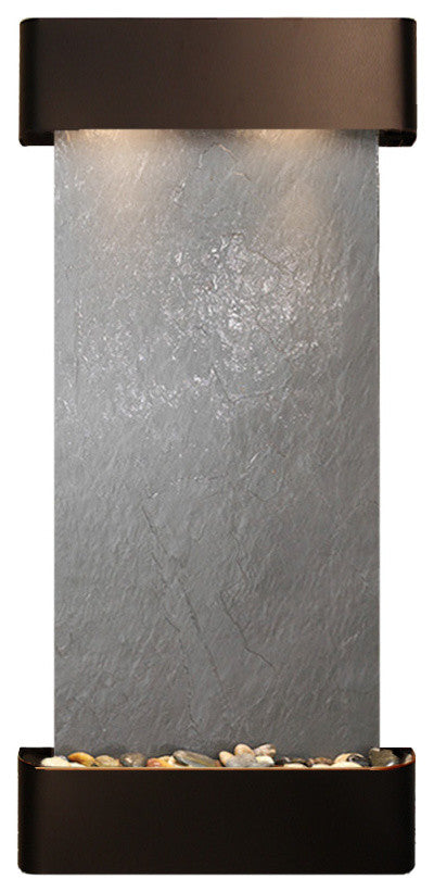 Come home and relax to the peaceful sounds of running water. The Cascade Springs water fountain is made with natural materials to enhance the feeling of the great outdoors in your room. This wall water feature includes our EZ install bracket and all hardware necessary to hang it on a sheet rock wall. With many different trim and water surface options, you are sure to find the perfect Cascade Springs for your space.25" L x 54" H x 6" D, easy to hang, complete with colored instructions and hardware for hanging on a sheetrock wall. Hanging Weight 65 lbs. This unit includes: 2 halogen light Polished river rocks Electric pump 3-way pull chain that allows you to run just lights, just water, or lights and water. Welded plastic liner insures against leaking and unique water distribution unit system will not clog. 110V, 100W; one cord operates entire unit; 90 degree plug can be concealed behind water feature. Durable powder coat finish; Manufactured and assembled in the USA with a 1 year limited warranty. • This light-weight slate veneer known as FeatherStone is natural stone and therefore may differ in color and texture from the photos shown.
