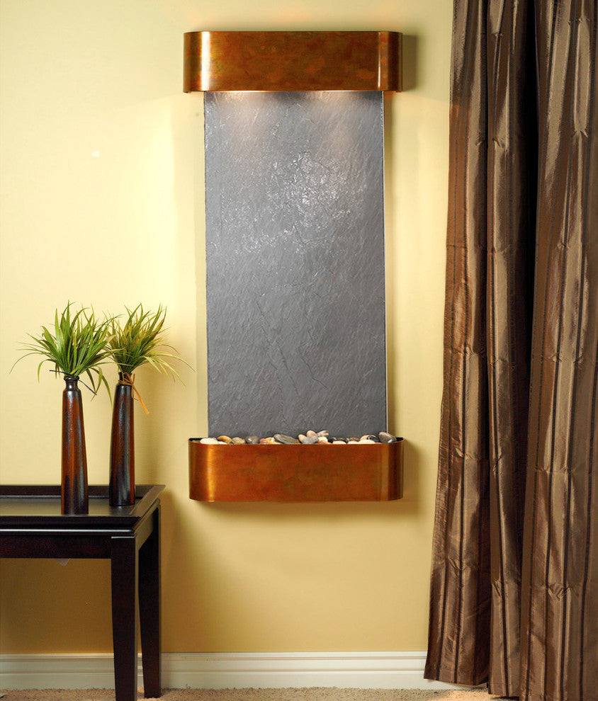Come home and relax to the peaceful sounds of running water. The Cascade Springs water fountain is made with natural materials to enhance the feeling of the great outdoors in your room. This wall water feature includes our EZ install bracket and all hardware necessary to hang it on a sheet rock wall. With many different trim and water surface options, you are sure to find the perfect Cascade Springs for your space.25" L x 54" H x 6" D, easy to hang, complete with colored instructions and hardware for hanging on a sheetrock wall. Hanging Weight 65 lbs. This unit includes: 2 halogen light Polished river rocks Electric pump 3-way pull chain that allows you to run just lights, just water, or lights and water. Welded plastic liner insures against leaking and unique water distribution unit system will not clog. 110V, 100W; one cord operates entire unit; 90 degree plug can be concealed behind water feature. Durable powder coat finish; Manufactured and assembled in the USA with a 1 year limited warranty. • This light-weight slate veneer known as FeatherStone is natural stone and therefore may differ in color and texture from the photos shown.
