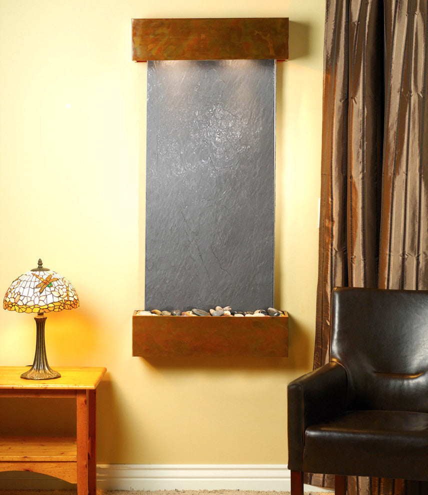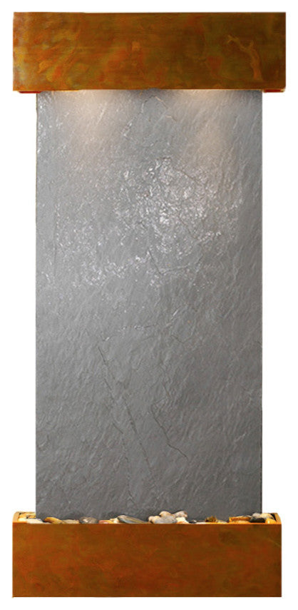 Come home and relax to the peaceful sounds of running water. The Cascade Springs water fountain is made with natural materials to enhance the feeling of the great outdoors in your room. This wall water feature includes our EZ install bracket and all hardware necessary to hang it on a sheet rock wall. With many different trim and water surface options, you are sure to find the perfect Cascade Springs for your space.25" L x 54" H x 6" D, easy to hang, complete with colored instructions and hardware for hanging on a sheetrock wall. Hanging Weight 65 lbs. This unit includes: 2 halogen light Polished river rocks Electric pump 3-way pull chain that allows you to run just lights, just water, or lights and water. Welded plastic liner insures against leaking and unique water distribution unit system will not clog. 110V, 100W; one cord operates entire unit; 90 degree plug can be concealed behind water feature. Durable powder coat finish; Manufactured and assembled in the USA with a 1 year limited warranty. • This light-weight slate veneer known as FeatherStone is natural stone and therefore may differ in color and texture from the photos shown.
