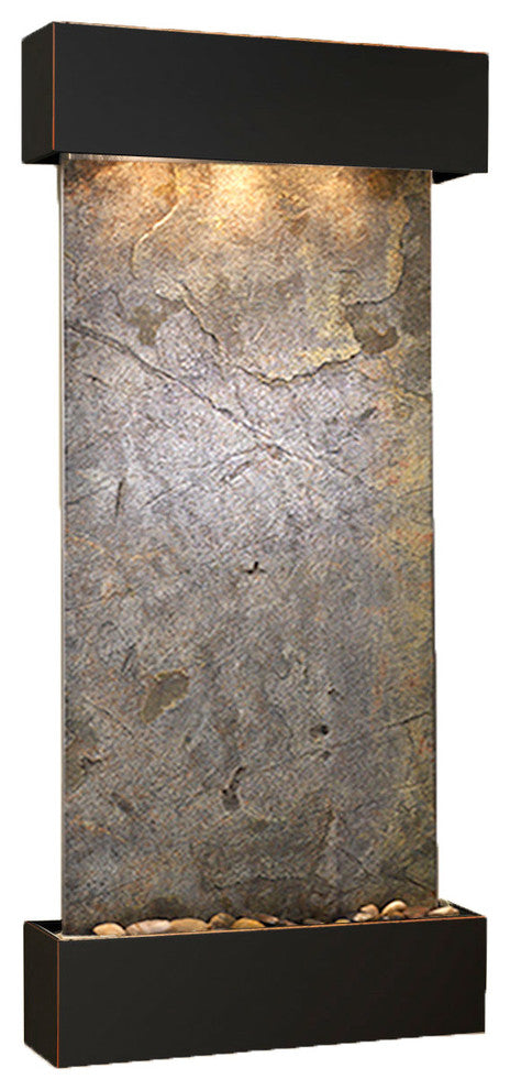 Come home and relax to the peaceful sounds of running water. The Cascade Springs water fountain is made with natural materials to enhance the feeling of the great outdoors in your room. This wall water feature includes our EZ install bracket and all hardware necessary to hang it on a sheet rock wall. With many different trim and water surface options, you are sure to find the perfect Cascade Springs for your space.25" L x 54" H x 6" D, easy to hang, complete with colored instructions and hardware for hanging on a sheetrock wall. Hanging Weight 65 lbs. This unit includes: 2 halogen light Polished river rocks Electric pump 3-way pull chain that allows you to run just lights, just water, or lights and water. Welded plastic liner insures against leaking and unique water distribution unit system will not clog. 110V, 100W; one cord operates entire unit; 90 degree plug can be concealed behind water feature. Durable powder coat finish; Manufactured and assembled in the USA with a 1 year limited warranty. • This light-weight slate veneer known as FeatherStone is natural stone and therefore may differ in color and texture from the photos shown.