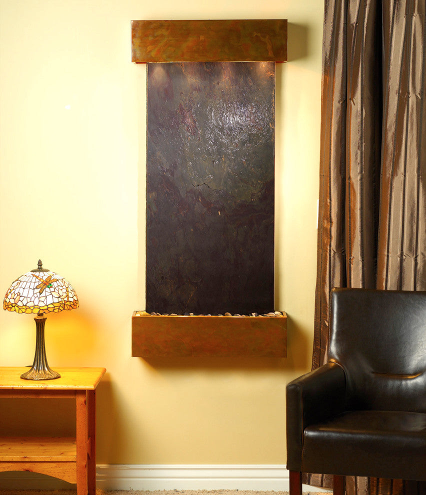 Come home and relax to the peaceful sounds of running water. The Cascade Springs water fountain is made with natural materials to enhance the feeling of the great outdoors in your room. This wall water feature includes our EZ install bracket and all hardware necessary to hang it on a sheet rock wall. With many different trim and water surface options, you are sure to find the perfect Cascade Springs for your space.25" L x 54" H x 6" D, easy to hang, complete with colored instructions and hardware for hanging on a sheetrock wall. Hanging Weight 65 lbs. This unit includes: 2 halogen light Polished river rocks Electric pump 3-way pull chain that allows you to run just lights, just water, or lights and water. Welded plastic liner insures against leaking and unique water distribution unit system will not clog. 110V, 100W; one cord operates entire unit; 90 degree plug can be concealed behind water feature. Durable powder coat finish; Manufactured and assembled in the USA with a 1 year limited warranty. • This light-weight slate veneer known as FeatherStone is natural stone and therefore may differ in color and texture from the photos shown.