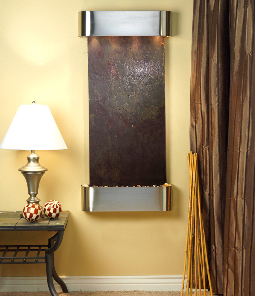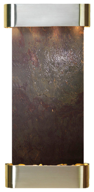 Come home and relax to the peaceful sounds of running water. The Cascade Springs water fountain is made with natural materials to enhance the feeling of the great outdoors in your room. This wall water feature includes our EZ install bracket and all hardware necessary to hang it on a sheet rock wall. With many different trim and water surface options, you are sure to find the perfect Cascade Springs for your space.25" L x 54" H x 6" D, easy to hang, complete with colored instructions and hardware for hanging on a sheetrock wall. Hanging Weight 65 lbs. This unit includes: 2 halogen light Polished river rocks Electric pump 3-way pull chain that allows you to run just lights, just water, or lights and water. Welded plastic liner insures against leaking and unique water distribution unit system will not clog. 110V, 100W; one cord operates entire unit; 90 degree plug can be concealed behind water feature. Durable powder coat finish; Manufactured and assembled in the USA with a 1 year limited warranty. • This light-weight slate veneer known as FeatherStone is natural stone and therefore may differ in color and texture from the photos shown.