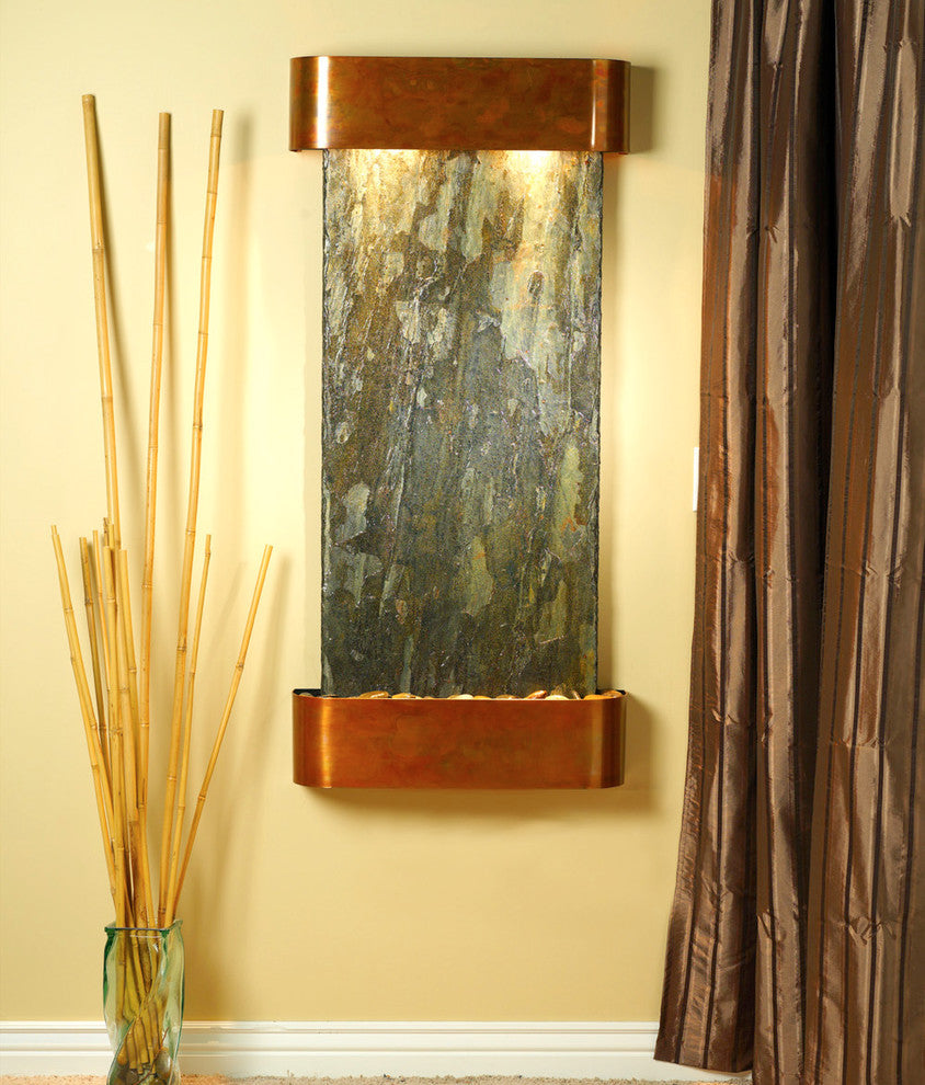 Come home and relax to the peaceful sounds of running water. The Cascade Springs water fountain is made with natural materials to enhance the feeling of the great outdoors in your room. This wall water feature includes our EZ install bracket and all hardware necessary to hang it on a sheet rock wall. With many different trim and water surface options, you are sure to find the perfect Cascade Springs for your space.25" L x 54" H x 6" D, easy to hang, complete with colored instructions and hardware for hanging on a sheetrock wall. Hanging Weight 165 lbs. This unit includes: 2 halogen light Polished river rocks Electric pump 3-way pull chain that allows you to run just lights, just water, or lights and water. Welded plastic liner insures against leaking and unique water distribution unit system will not clog. 110V, 100W; one cord operates entire unit; 90 degree plug can be concealed behind water feature. Durable powder coat finish; Manufactured and assembled in the USA with a 1 year limited warranty. • All slates are natural and may differ in color and texture from the picture shown due to their natural uniqueness.