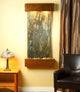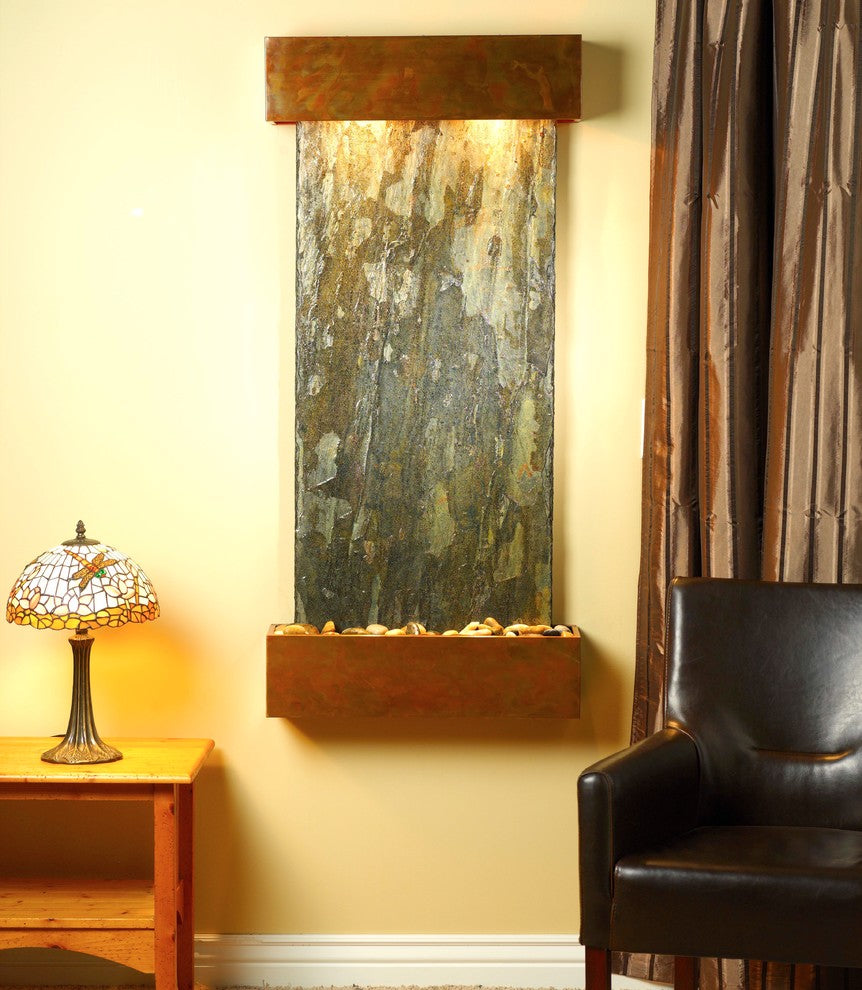 Come home and relax to the peaceful sounds of running water. The Cascade Springs water fountain is made with natural materials to enhance the feeling of the great outdoors in your room. This wall water feature includes our EZ install bracket and all hardware necessary to hang it on a sheet rock wall. With many different trim and water surface options, you are sure to find the perfect Cascade Springs for your space.25" L x 54" H x 6" D, easy to hang, complete with colored instructions and hardware for hanging on a sheetrock wall. Hanging Weight 165 lbs. This unit includes: 2 halogen light Polished river rocks Electric pump 3-way pull chain that allows you to run just lights, just water, or lights and water. Welded plastic liner insures against leaking and unique water distribution unit system will not clog. 110V, 100W; one cord operates entire unit; 90 degree plug can be concealed behind water feature. Durable powder coat finish; Manufactured and assembled in the USA with a 1 year limited warranty. • All slates are natural and may differ in color and texture from the picture shown due to their natural uniqueness.