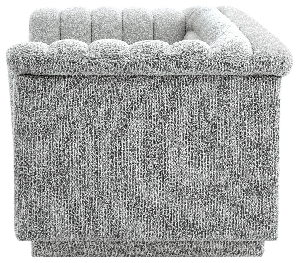 Give your room a much-needed rehab when you bring home this Cascade boucle grey boucle fabric, this seat quickly becomes everyone''s favorite spot for curling up with a good book or smart device. Thick foam padding ensures a cozy, body-hugging experience. while you watch TV or just relax.Overall Product Dimensions: 72" W x 34" D x 28" HRich Grey Boucle FabricDeep Channel TuftingCurved ArmsContemporary DesignSeat Dimensions: Seat Width: 48"Seat Height: 17"Seat Depth: 24"Arm Height: 28"Back Height: 11"