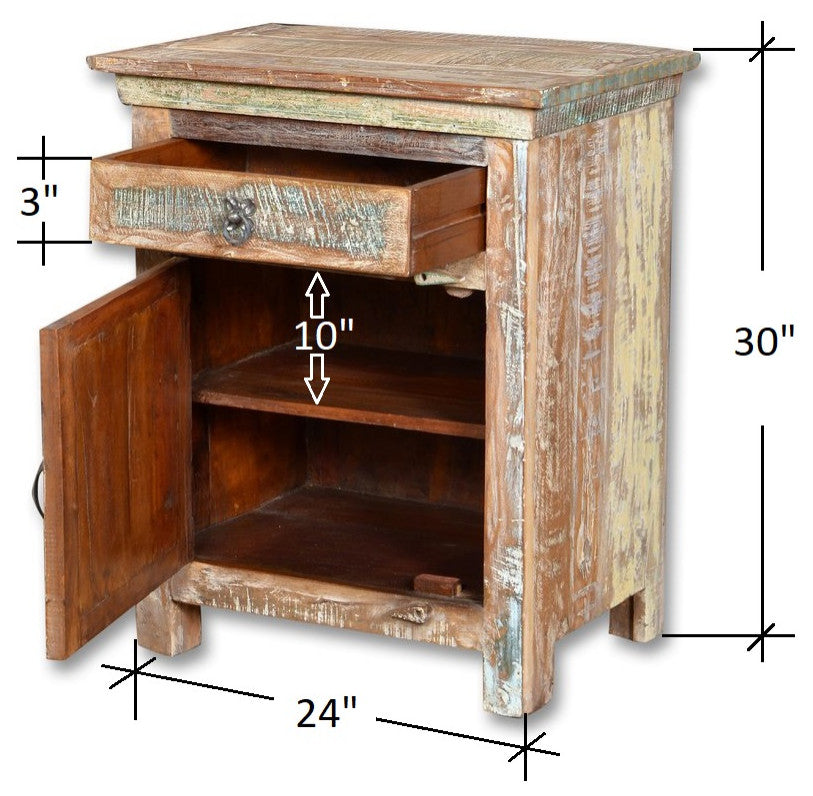 Elevate your bedroom decor with this exquisite nightstand, crafted from recycled wood for a rustic-inspired aesthetic. Its artful design includes a drawer with a metal ring pull, perfect for storing small items, and a shutter door cabinet for additional storage. With its naturally distressed look, it adds character and warmth to your sleeping space.