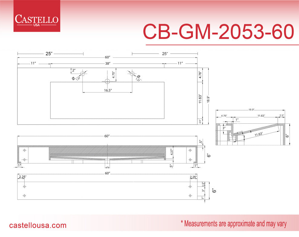 CastelloUSA Pyramid Solid Surface Wall Mounted Ramp Basin Sink, White, 60", No Faucet Hole