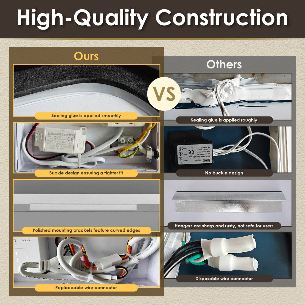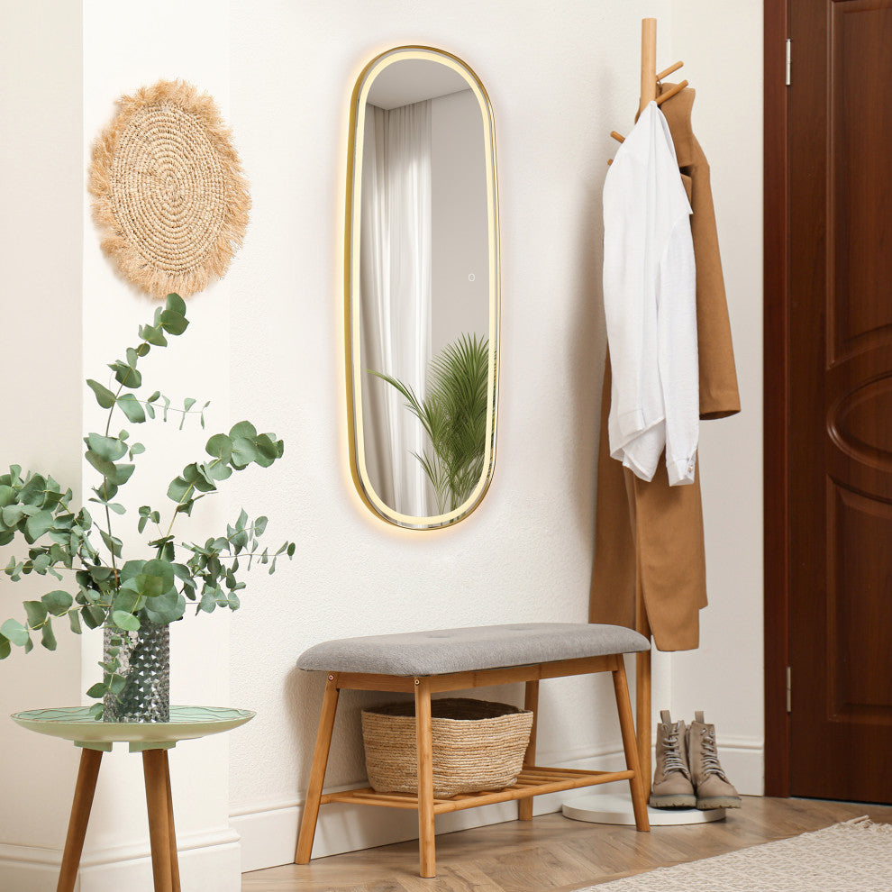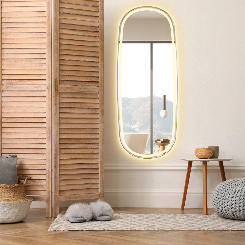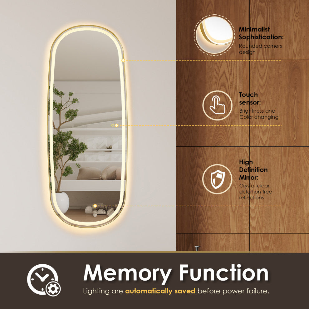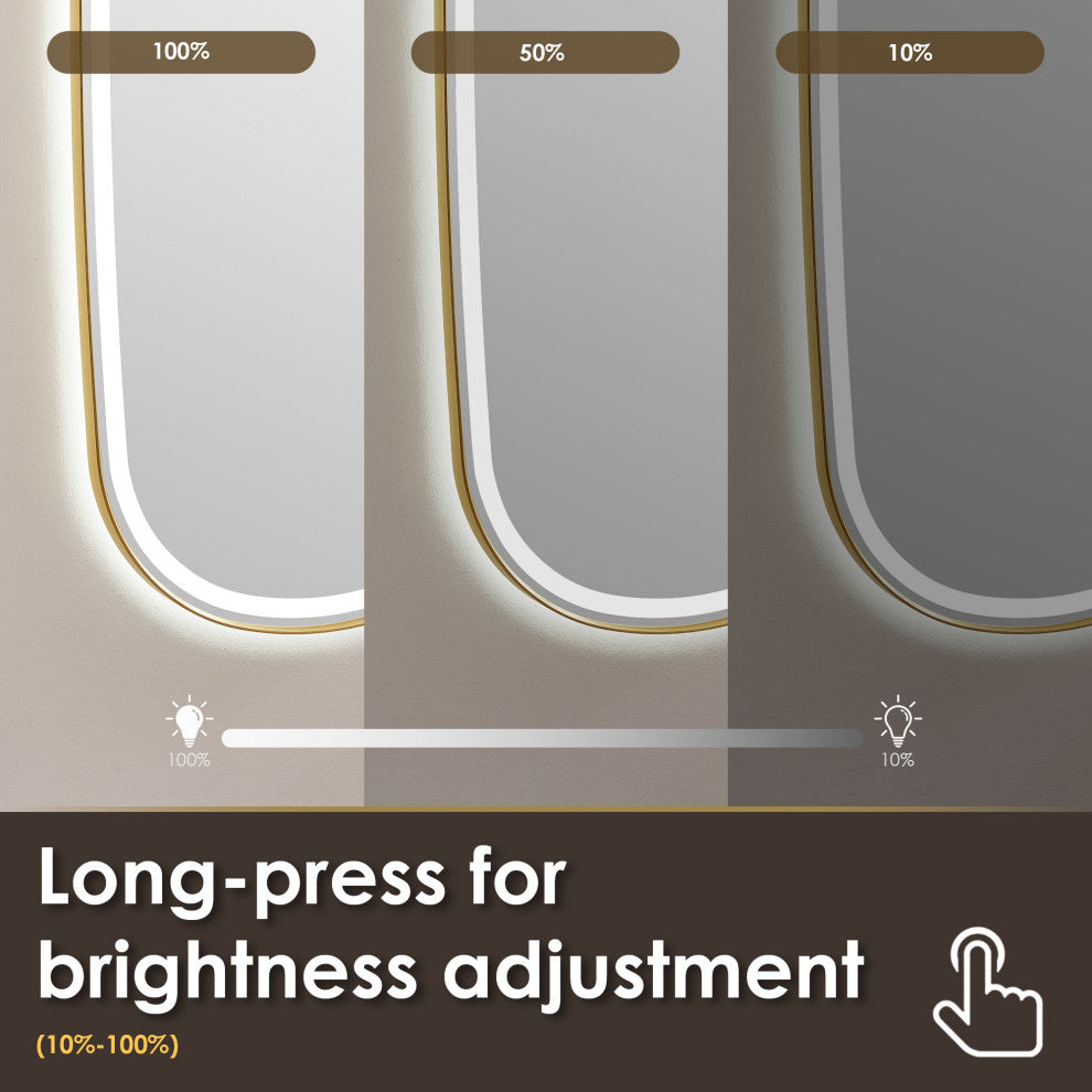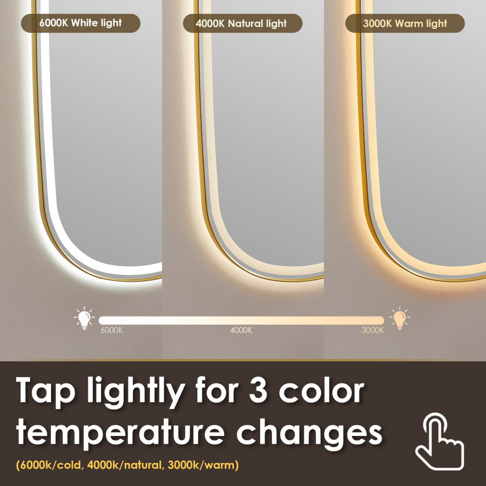 Make a bold statement with this contemporary LED dress mirror, designed to elevate any dressing area or entryway. Featuring a sleek aluminum frame available in Matte black or brushed gold, this mirror combines minimalist elegance with advanced functionality. The mirror boasts both front-lit and back-lit LED lighting, providing even, glare-free illumination ideal for full-body reflection. Its touch sensor allows for easy dimming and color temperature adjustment, offering customizable lighting to suit your mood or environment. Additional features like anti-fog technology and an explosion-proof design ensure safety, durability, and clarity in any setting.FeaturesDurable Material: Elegant aluminum alloy frame not only enhances the overall practicality of the mirror but also ensures durability.Stylish: A rounded corner silhouette and a modern sloping edge design adds a modern touch, making it a stylish addition to any room.Dual Lighting: Features both front-lit and back-lit illumination, with an acrylic design that diffuses the light for a softer, more comfortable glow."Adjustable: Adjust the light and color temperature by touching the mirror according to your mood.oTap lightly for 3 color temperature changes (6000k/cold, 4000k/natural, 3000k/warm).oLong-press for brightness adjustment (10%-100%)."Explosion-proof: The mirror is made of 5mm eco-friendly mirror with explosion-proof film prevents splashes caused by accidental breakage of the mirror, which ensures that the mirror is safe and reliable.High Definition Mirror: Crystal-clear, distortion-free reflections allow you to appreciate yourself from every angle, elevating your daily routine.Anti-fog function: Includes a demister pad to prevent fog and condensation buildup, maintains a clear reflection in humid conditions.Waterproof: The mirror achieves an IP44 waterproof rating, supporting safe use in any wet environment.Memory function: Lighting settings before power failure are automatically saved.Safe and Reliable: The mirror is ETL-certified and features a UL-certified driver with an integrated ground wire, ensuring adherence to the highest safety and reliability standards.Available in two elegant finishes: Matte Black and Brushed Gold, this mirror offers versatile style options to suit your decor.Easy Installation: Thoughtfully ground edges of hanging Z-bars, ensuring safe and hassle-free installation.Enclosed Back Sheet: Tidy, fully enclosed alloy-coated back sheet with easy-access design, allows for hassle-free accessory replacement, minimizing maintenance costs and ensuring long-term durability.Multiple Hanging Modes: Designed for both horizontal and vertical mounting, this mirror offers flexible options to suit a variety of settings and preferences.Full Warranty: 1-Year Manufacturer Warranty"”purchase with peace of mind.