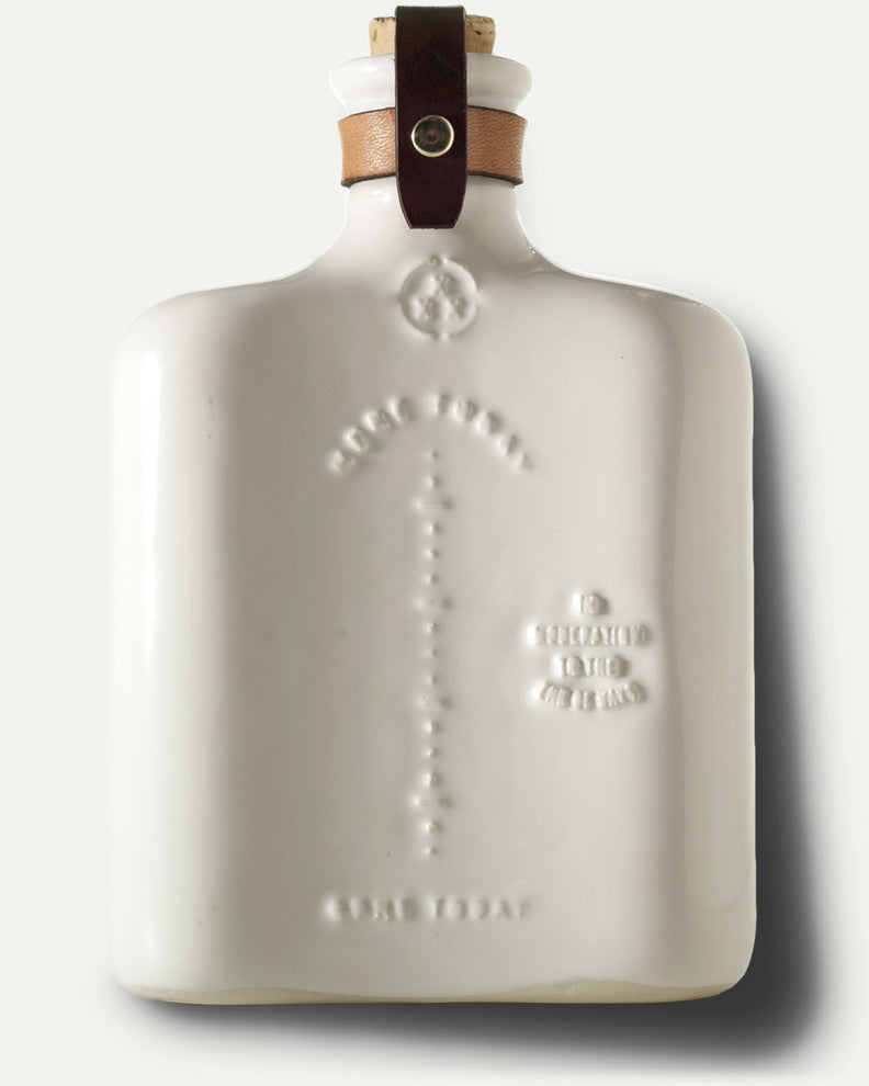 The Ceramic Flask is a newly designed drinking flask made with quarter inch ceramic white slip cast and accented with 2 leather straps, brass stud and brass button. Made in America. The flask is 4.25 x 6.5 inches. The dark leather is oil tanned and the light leather is vegetable tanned. The flask also has an embossing.