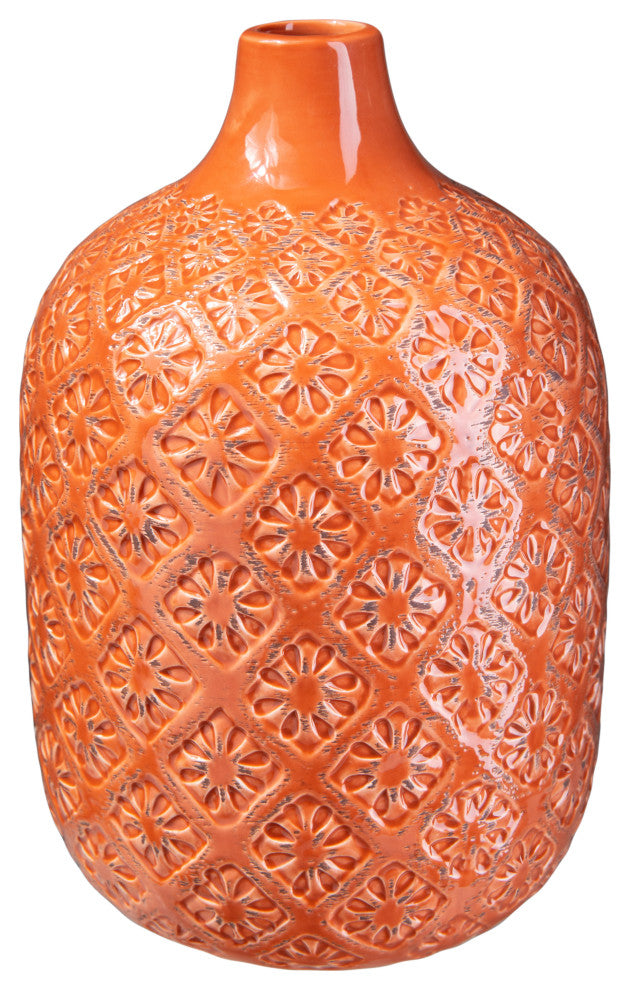 Ceramic Vase in Narrow Mouth, Diamond Pattern Design Gloss Orange Finish, Large