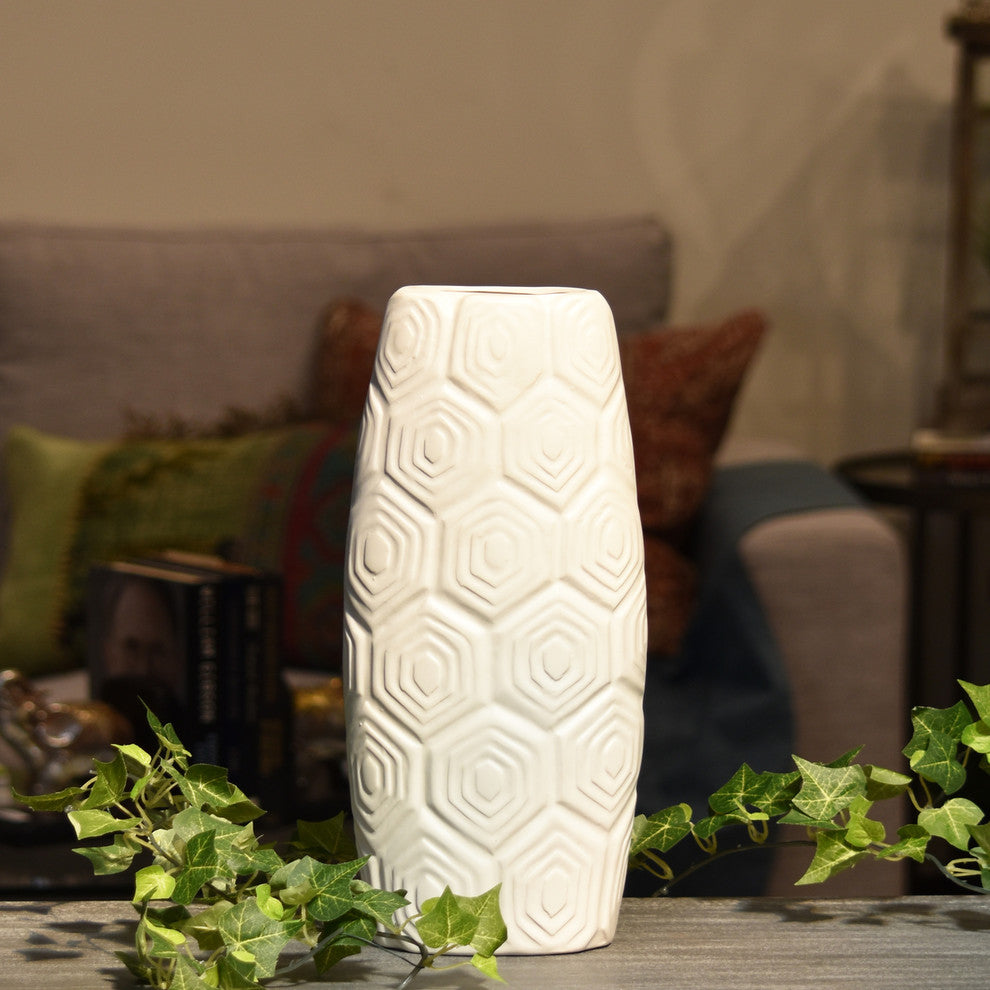 UTC21403 Ceramic Oval Vase with Embossed Hexagonal Design Matte Finish White.Great addition to your home and garden accents. For decorative purposes only. Urban Trends Collection.Product Size: 6.00"x4.00"x14.50"HSold in Pack of 1 pc.Material: Ceramic