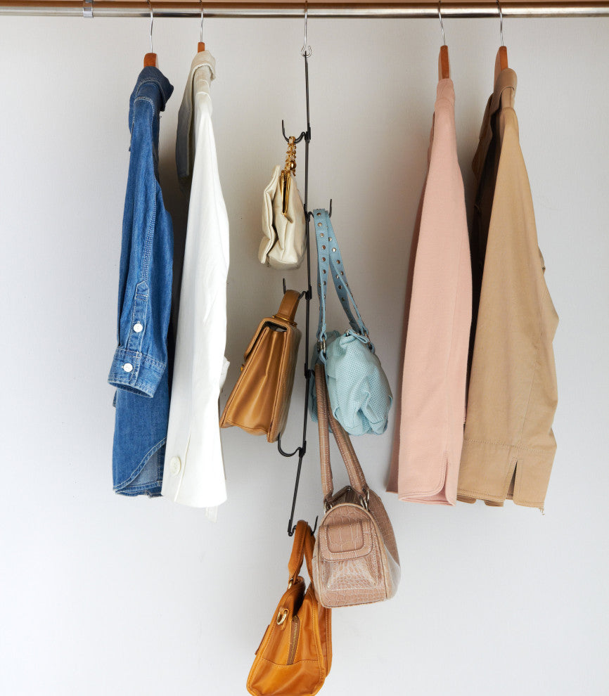 The best way to store handbags. It can hang in the closet and hook onto a door or screw into a wall. The components are removable so you can customize the size. It presents bags in a pleasing waterfall formation.