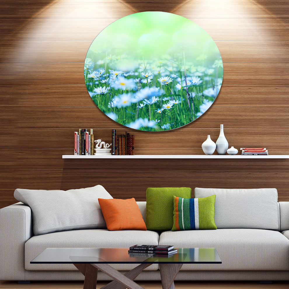 Bring Contemporary Abstraction to your home with this large Circle Metal wall art. This Chamomile Flowers on Green Background Metal Artwork makes it the focal point of any room or office.