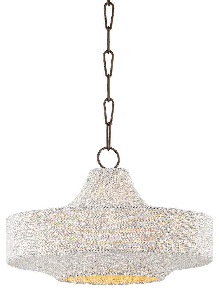 Inspired by the sea-faring community of Scotland, Thurso hovers between tension and release. Recalling the comfort of a ferry station during harsh conditions, the artist Chandler McLellan sought to imbue this pendant with a soft warmth in both materiality and luminance. A thick off-white cotton crochet fabric has been stretched across the tiered framework of the fixture, naturally dipping in certain areas. As the weave eases and pulls, it creates larger and smaller gaps for light to escape. Coordinating with the earthy nature of the cord, the Bronze metalwork anchors this light-as-air pendant. Part of our Chandler McLellan collection.