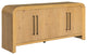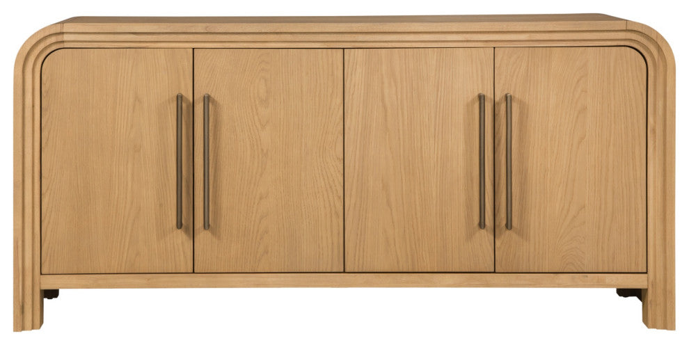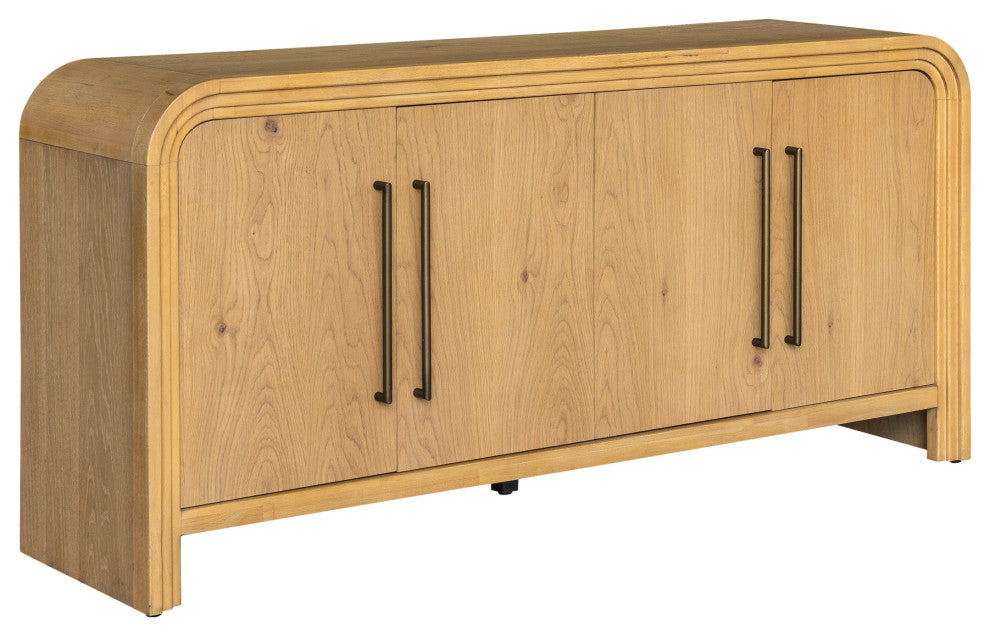 The Chandler Sideboard is crafted with solid wood and flat-cut oak veneers in a light oak finish. Its modern design boasts smooth, rounded edges and step-molding detailing. The four doors feature oversized antique brass handles, concealing adjustable shelves with media cord management. Finished in white oak with antique brass accents, it embraces natural wood grain variations.