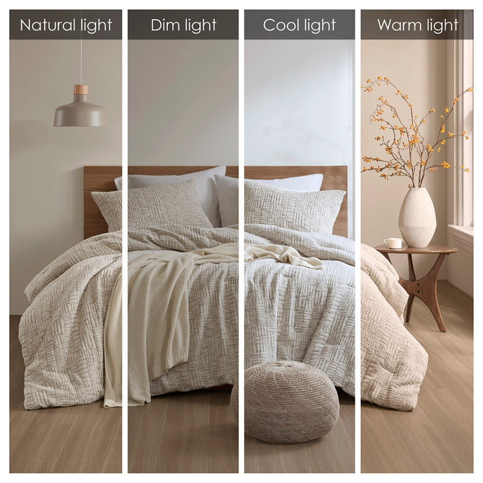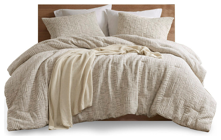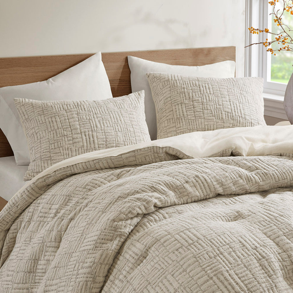 Experience effortless style with our Chapel Hill Harper Comforter Set. With its intricate design and luxurious feel, it offers year-round sophistication, turning your bed into an eye-catching centerpiece. The set includes a comforter and two shams with an overlap closure for a complete, indulgent bedroom transformation. Crafted from 100% cotton with a 100% polyester filling, this set ensures absolute comfort. The visible bartacks help maintain the shape and quality of the inserts. Plus, our hypoallergenic polyester inserts and pillow filling are free from allergens and dustproof. For care, machine wash cold on a gentle cycle (refer to care label), and for best results, use a commercial washer and dryer for ample room during cleaning.FEATURESSet includes comforter and 2 shams (overlap closure)100% cotton comforter and shams, 100% polyester filling Features a geometric pattern that brings texture and visual interest to your bedroom Visible bartacks, helps maintain the inserts shape and quality Hypoallergenic polyester inserts and pillow filling contains no allergens and is dustproofOEKO-TEX labeled textile certified as safe on skin Machine Wash Cold, Gentle Cycle (see care label)Commercial washer and dryer recommended to provide ample room for movementMATERIALSComforter/Shams: 100% cotton matelasse, 100% cotton solid reverseFill: 100% polyesterSIZE 1 Comforter:90"W x 92"L2 Standard Shams:20"W x 26"L (2)