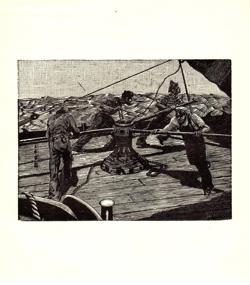 "Heave up!" by Charles E. Pont, 1938 Unsigned Woodblock. Paper size is 9.25 x 9 inches, with an image size of 5 x 6.75 inches. The Woodblock is from an unknown edition size. and is not framed. The condition was rated A: Mint. Additional details: Part of AMERICAN BLOCK PRINT CALENDAR, 1938, published by Gutenberg Publishing Co., Milwaukee, Wisconsin, copyright 1937, total of 12 prints. This calendar is part of the second yearly publication round.