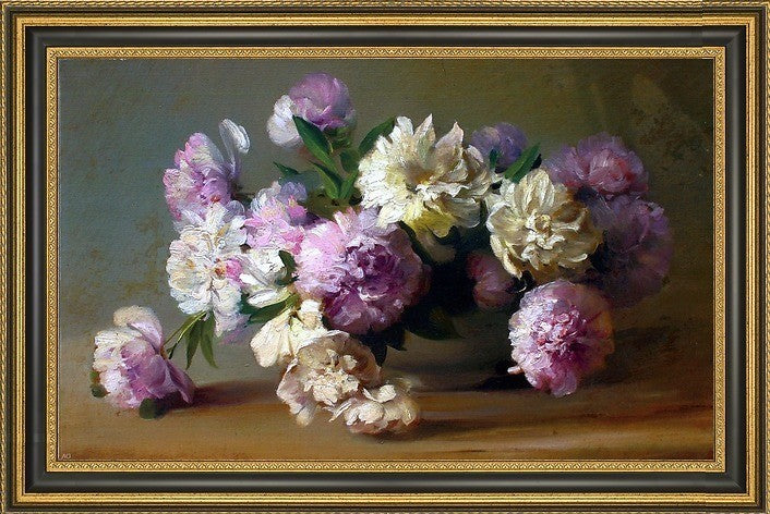 18" x 27" Charles Ethan Porter Peonies in a Bowl framed premium canvas print reproduced to meet museum quality standards. Our Museum quality canvas prints are produced using high-precision print technology for a more accurate reproduction printed on high quality canvas with fade-resistant, archival inks. Our progressive business model allows us to offer works of art to you at the best wholesale pricing, significantly less than art gallery prices, affordable to all. This artwork is hand stretched onto wooden stretcher bars, then mounted into our 3 3/4" wide gold finish frame with black panel by one of our expert framers. Our framed canvas print comes with hardware, ready to hang on your wall. We present a comprehensive collection of exceptional canvas art reproductions by Charles Ethan Porter.