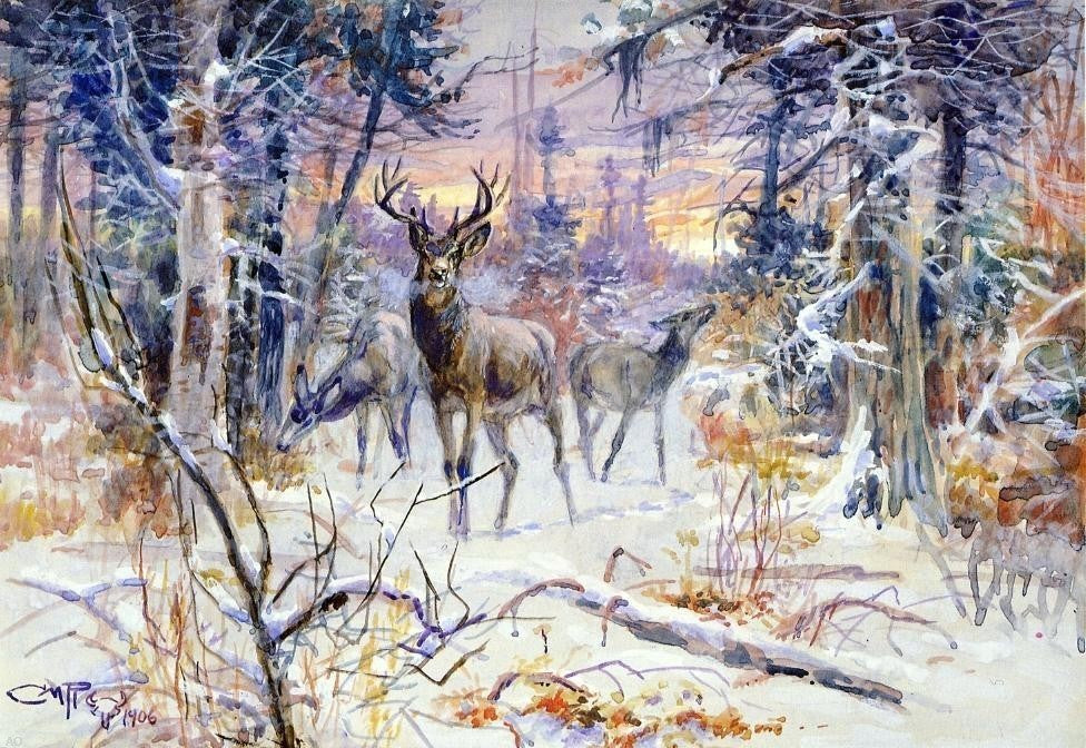Charles Marion Russell A Deer in a Snowy Forest - 18" x 27" Premium Canvas Print
