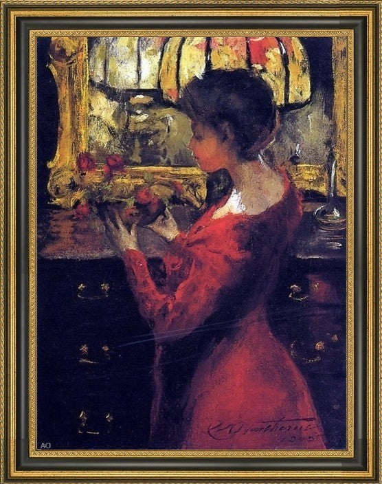 18" x 24" Charles Webster Hawthorne Crimson Roses framed premium canvas print reproduced to meet museum quality standards. Our Museum quality canvas prints are produced using high-precision print technology for a more accurate reproduction printed on high quality canvas with fade-resistant, archival inks. Our progressive business model allows us to offer works of art to you at the best wholesale pricing, significantly less than art gallery prices, affordable to all. This artwork is hand stretched onto wooden stretcher bars, then mounted into our 3 3/4" wide gold finish frame with black panel by one of our expert framers. Our framed canvas print comes with hardware, ready to hang on your wall. We present a comprehensive collection of exceptional canvas art reproductions by Charles Webster Hawthorne.