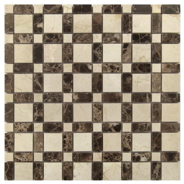 Checker Blend Pattern 12x12 Marble Mosaic tiles feature a beautiful combination of browns, beiges, and tans creating warmth in any room. Combination of Crema marfil and emperador dark marble have been used by many designers and homeowners. Best uses inclu