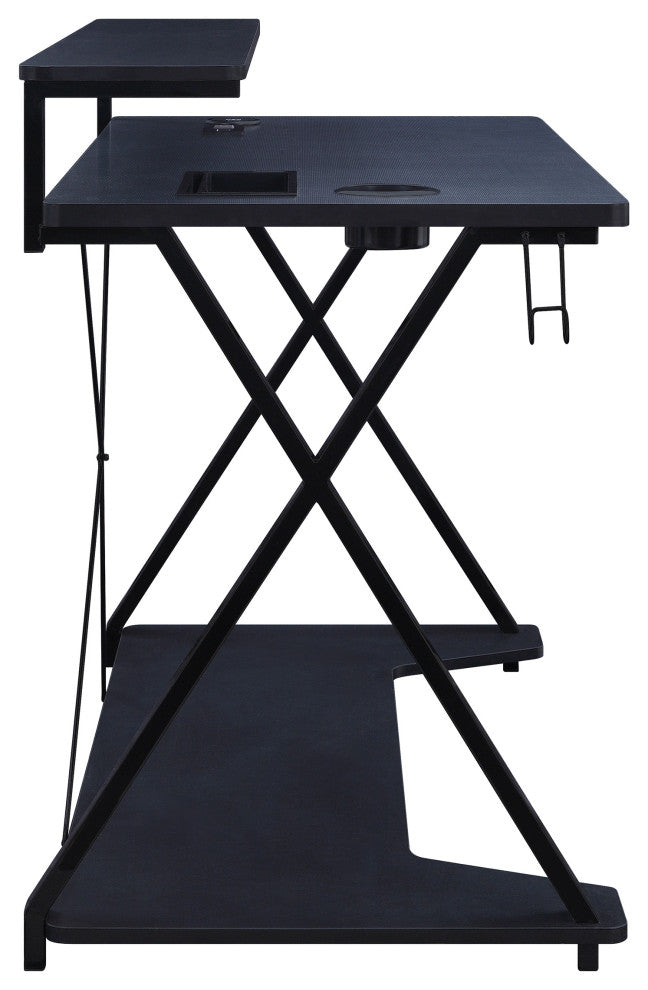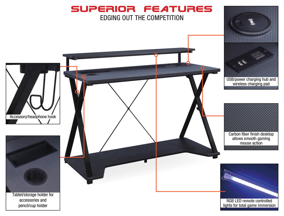 Immerse yourself in gaming fun with the Checkpoint Ghost Battlestation Gaming Desk. Stay powered up with built in power outlet, 2 dual USB charging ports and the ease of a wireless device charging pad. Remote controlled multi-colored LED lights optimizes the excitement of game play. Upper shelf positions dual monitors at the optimum viewing level and keeps the main desktop area clear for multi-functioning tasks. Accessory hook, flush storage tray, built-in cup holder and lower tower shelf complete your perfect gaming console.