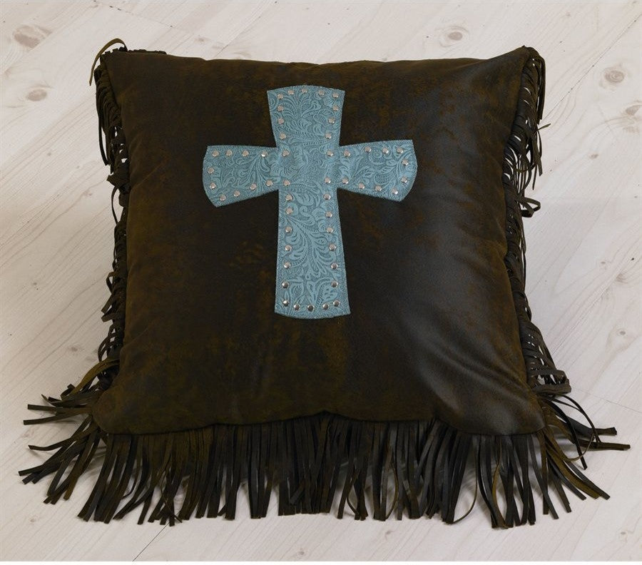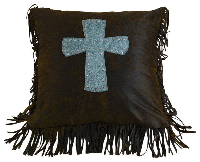 Rich faux leather sets the stage for a bold tooled leather cross. Bordered in stylish silver studs and framed with faux leather fringe, this accent pillow provides a truly western focal point for any room. This pillow is part of the larger Cheyenne Red ensemble which combines tooled faux leather in bold western red with turquoise and faux leather accents for a statement of western luxury.