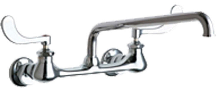 The Chicago 631-L12WXFABCP Manual and Metering Faucet. This hot/cold water sink faucet features 8" fixed centers, a 12" L-Type swing spout, and a set of 4" wristblade handles. It comes with a 2.2 GPM aerator, Quaturn compression operating cartridge, and a straight 2" inlet supply arm with wall flange and 1/2" NPT female threaded inlet. It comes in a bright, Chrome finish.