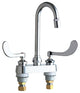 The Chicago 895-317E36ABCP Manual and Metering Faucet. This hot/cold water sink faucet features 4" fixed centers, a 3-1/2" rigid/swing gooseneck spout, and a set of 4" wristblade handles. It comes with a Quaturn compression operating cartridge, a 1.5 GPM non-aerating Laminar outlet, and 1/2" NPSM supply inlets and coupling nuts for 3/8" or 1/2" flexible risers. It comes in a bright, Chrome finish.