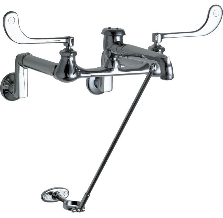 The Chicago 815-VBCP Manual and Metering Faucet. This hot/cold water sink faucet features an 8" body with adjustable arms from 3" to 13", a 7-1/2" rigid atmospheric vacuum breaker spout with pail hook and pipe support, and a set of 6" elbow blade handles. It comes with a Quaturn compression operating cartridge, and a 2-1/2" offset supply arm with integral shut off stop and 1/2" NPT female thread inlet. It also features 5" inlet supply extensions, a 3/4" male hose thread outlet, and a 2-5/16" diameter slip flange. It comes in a bright, Chrome finish.Features:8" Body, Adjustable Arms 3 - 13"2 5/16" Diameter Slip FlangeAtmospheric Vacuum Breaker, Not Intended for Continuous Pressure ApplicationsChrome Plate FinishWeight: 10.688lbsPackage Dimensions: 14.00"L x 13.00"W x 5.75"HCFNow! - eligible to ship within 24 hours after order acknowledgement5-Year Limited Cartridge Warranty 1-Year Limited Finish Warranty1-Year Limited Finish Warranty7 1/2" Center to Center Atmospheric Vacuum Breaker Spout with Pail Hook815-SVB - 7-1/2" Rigid Spout with Pail Hook and Pipe Support8.5 GPM Flow at 60 PSI319-PR - 6" Elbow Blade HandleXT - Quaturn Compression Operating CartridgeRAB - 2-1/2" Offset Supply Arm with Integral Shut-off Stop with 1/2" NPT Female Thread Inlet3/4" Male Hose Thread Outlet5" Inlet Supply Extensions