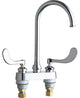 The Chicago 895-317GN2AFCABCP Manual and Metering Faucet. This hot/cold water sink faucet features 4" fixed centers, a 5-1/4" flow control rigid/swing gooseneck spout, and a set of 4" wristblade handles. It comes with a Quaturn compression operating cartridge, a 1.5 GPM Laminar flow control insert, and 1/2" NPSM supply inlets and coupling nuts for 3/8" or 1/2" flexible risers. It comes in a bright, Chrome finish.Features:4" Fixed CentersECAST? construction with equal to or less than 0.25% lead content by weighted averageThis item ships 5 business days from order acknowledgement5-Year Limited Cartridge Warranty 1-Year Limited Finish Warranty1-Year Limited Finish WarrantyGN2AFC - 5-1/4" Flow Control Rigid / Swing Gooseneck Spout1.5 GPM (5.7 L/min) Laminar Flow Control Insert in Spout Inlet317-PR - 4" Wristblade HandleXTAB - Quaturn Compression Operating Cartridge1/2" NPSM Supply Inlets and Coupling Nut for 3/8" or 1/2" Flexible RiserChrome Plate FinishWeight: 5.000lbsPackage Dimensions: 11.50"L x 6.00"W x 5.00"H