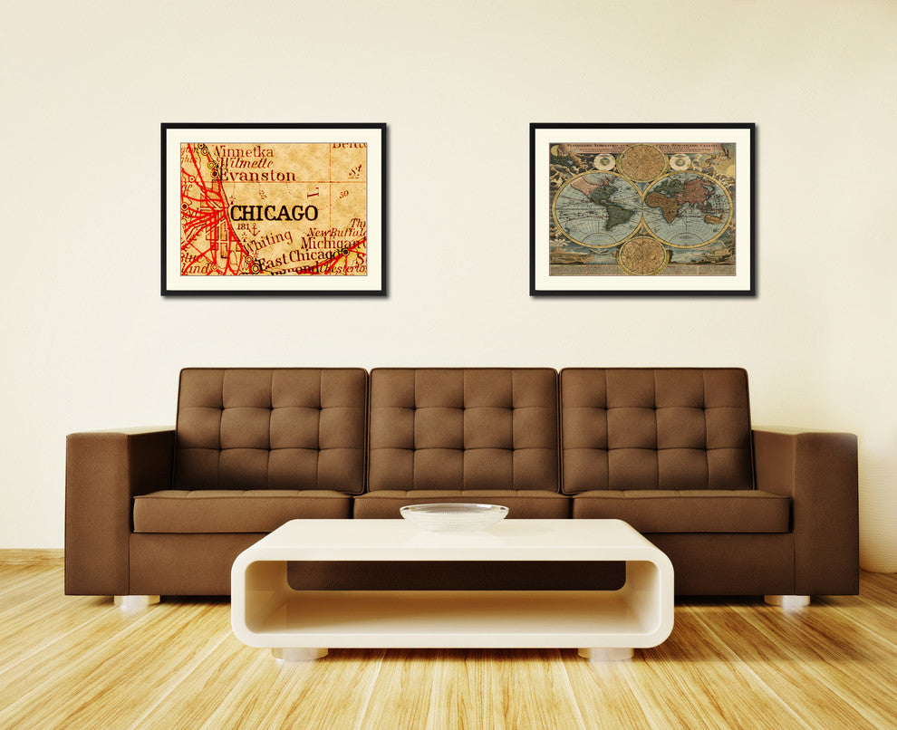 Chicago, Illinois Vintage Map Print On Canvas With Picture Frame 16" X 21"