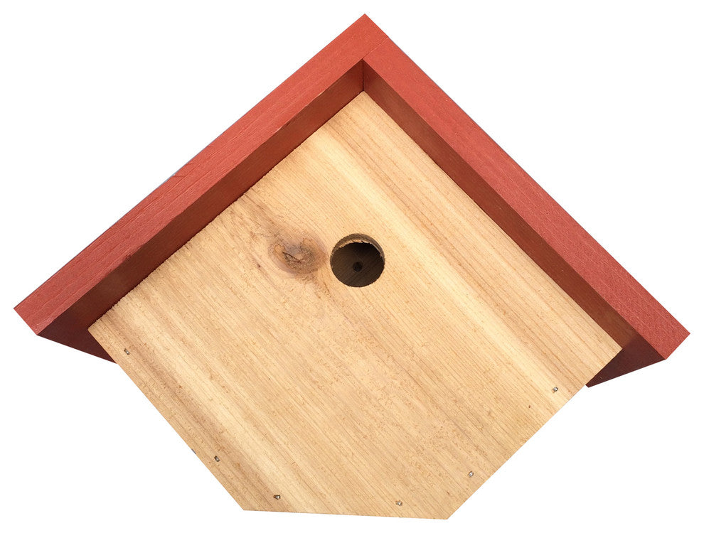 Chickadee or any small bird. The house is vented on the top and bottom. It is made of premium, rough cedar so the birds can cling when entering and leaving. Access panel for easy cleaning. Each house has been hand crafted and is unique. Mount the house on poles, fence posts or trees at least 3'' above the ground, ideally 4''. Comes in Natural or Red roof. Made in the USA.