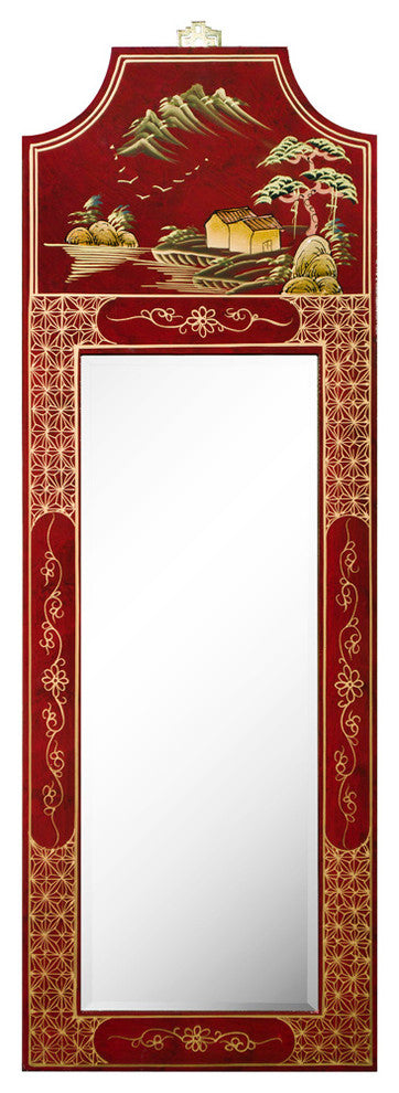 The frame can turn a simple mirror into a work of art. Hand-painted with gold decorative design on red lacquered wood, the top is decorated with hand painted Chinese landscape scene accents. Brass hanging hook is included. This item will be shipped from Westmont, IL 60559 U.S.A Use: Wall Mirror Material: Wood, Glass Color: Red Lacquer Finish, Gold Accents, Mother of Pearl Inlay Make: Hand-crafted Origin: China Dimensions: W 14"/D 1.5"/H 40" Weight: 9.5 lb Attributes: Wall Decor, Wood Frame, 40 to 44 inches, Brass Hanging Hook, Oriental