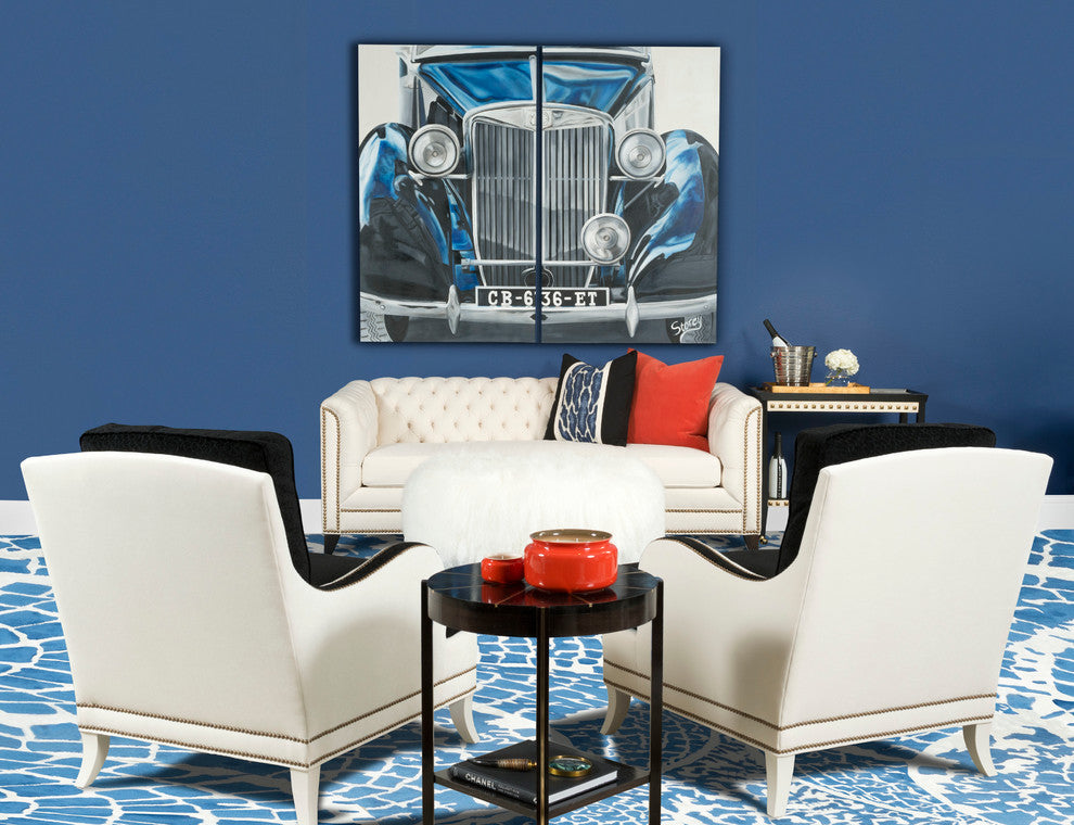 This classic Chesterfield was updated by removing the usual oversized rolled arms, adding a cleaner leg, and lots of nails. This is a sofa for any space. Fabricated with a profound respect for the environment the luxury construction of this piece includes a kiln dried sustainably forested maple frame, eight way hand tied coils, and a sumptuous spring down cushion. It is also hypoallergenic and flame retardant free. Proudly MADE in the USA.Seat Height : 20"Frame: Dark WalnutUpholstery: Off White Denim Nails: 1/2 Gold