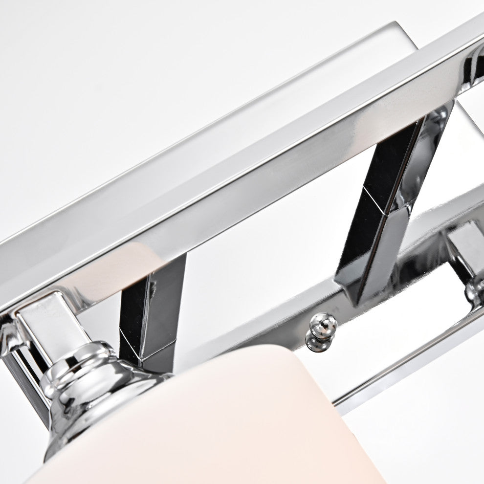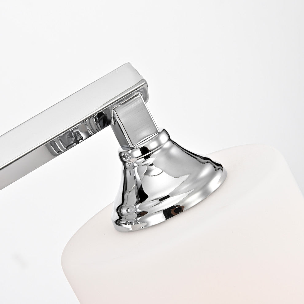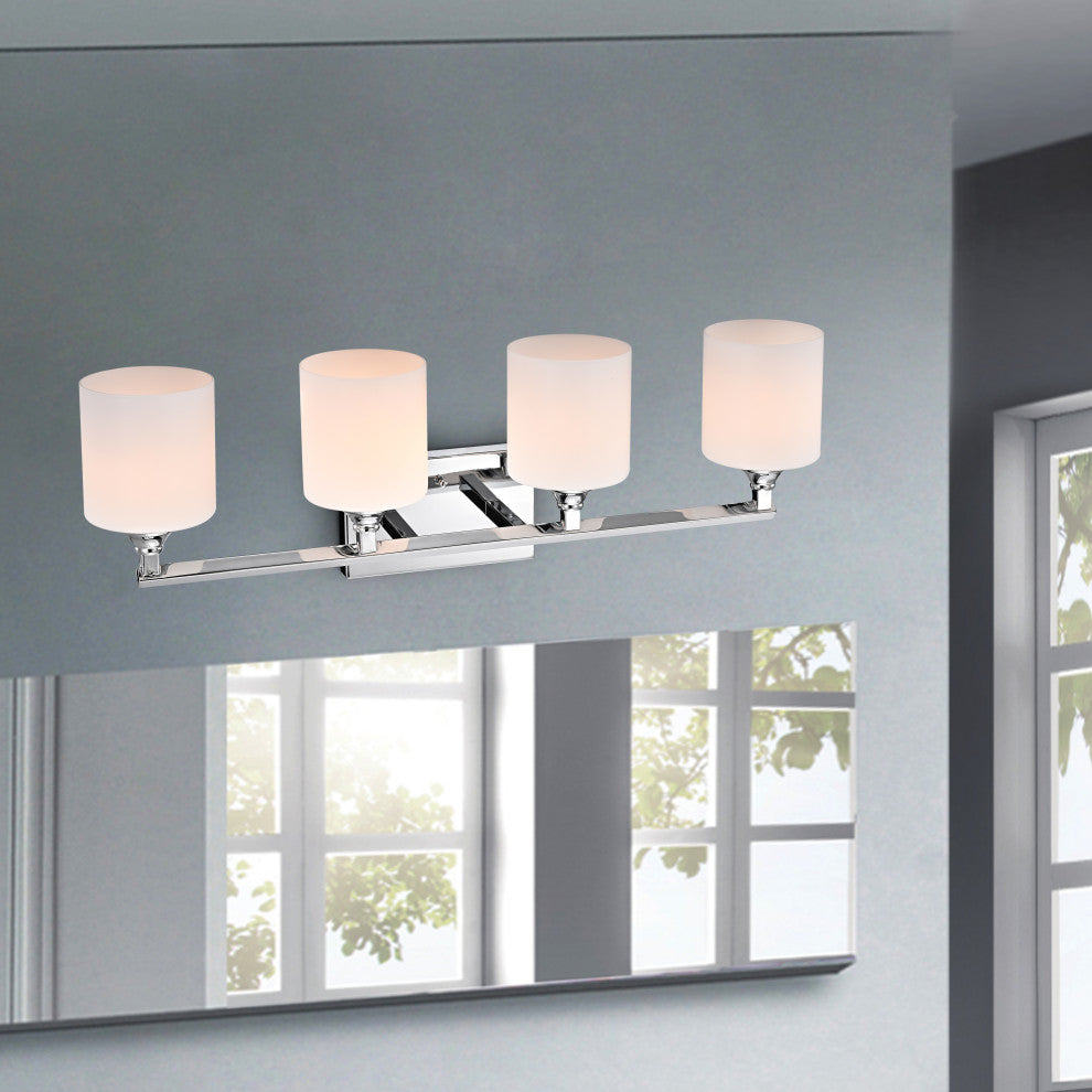 This is a wonderfully simplistic design of a bathroom vanity light fixture. The soft colors of the etched white glass shade atop of the chrome finish bar is is just the piece your restroom needs! This fixture can be installed with the lights facing upwards and downwards. Also the open, cylindrical shades, are the cherry on top, allowing easy lightbulb changes. This fixture takes four 100W E26 bulbs, and is compatible with flourescent, incandescent, and LED bulbs. This fixture is damp listed and UL listed.