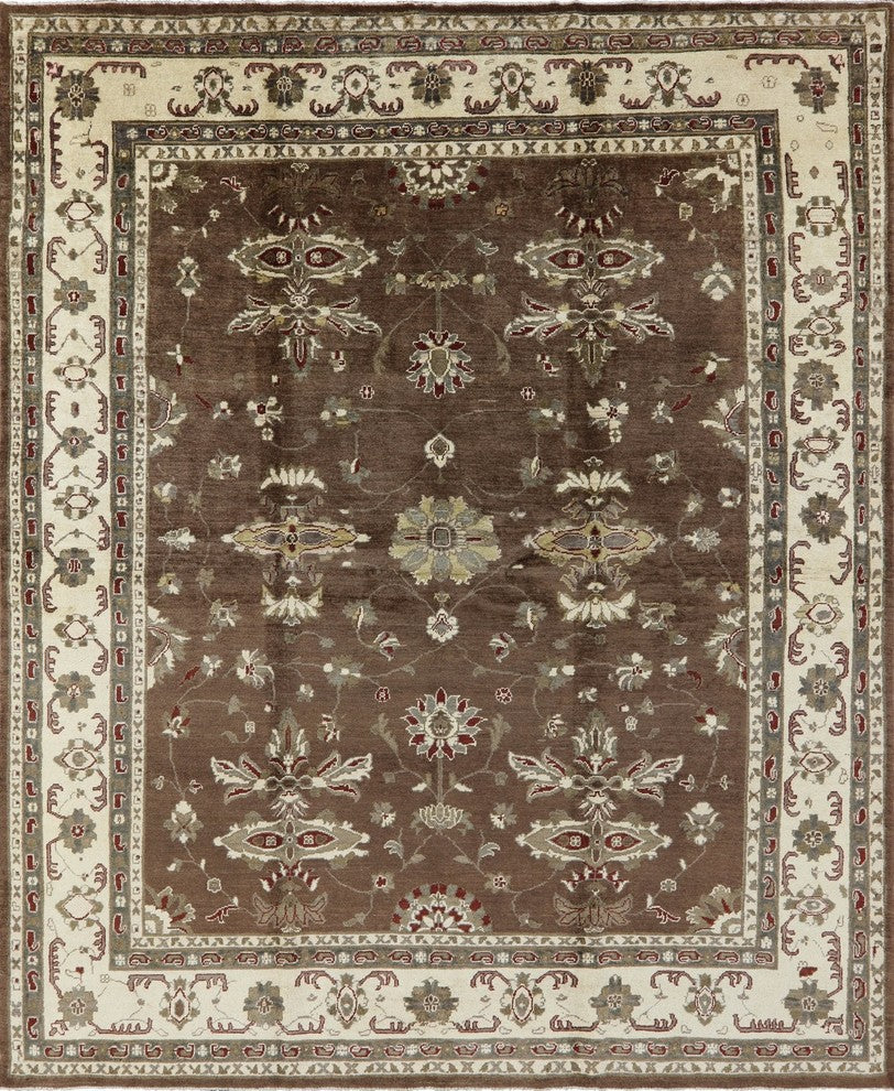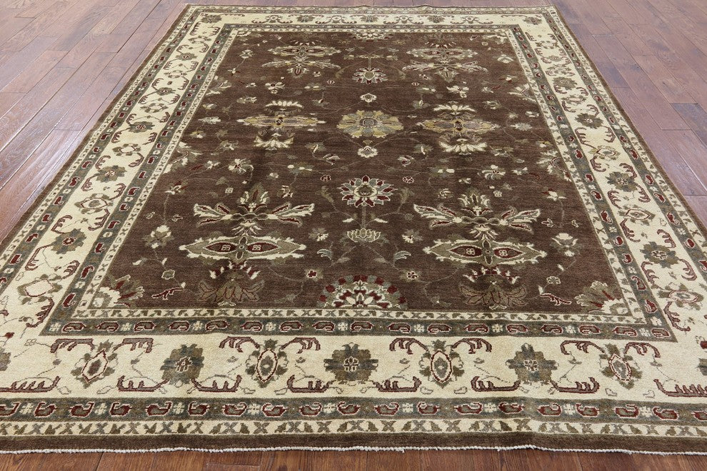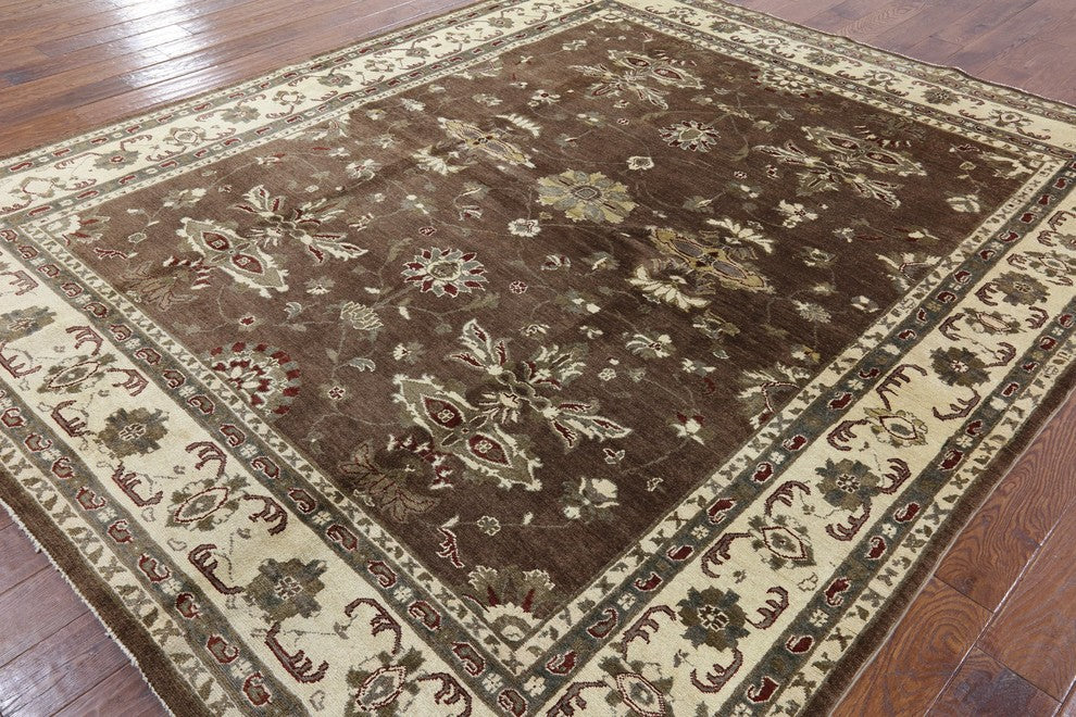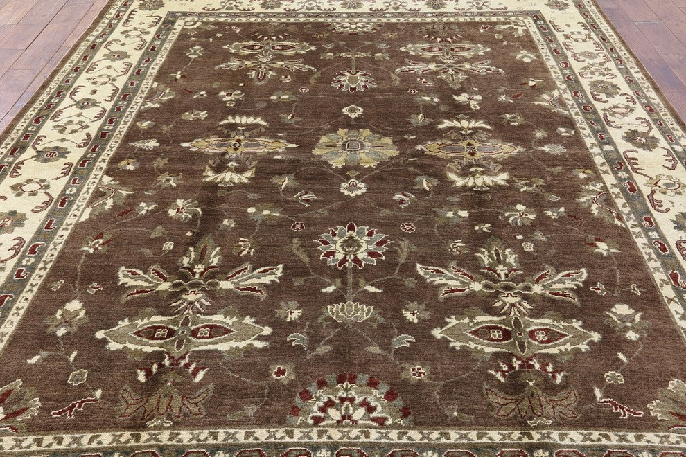 Chobi Peshawar Quality Brown Hand-Knotted Oushak Wool Rug, 8'x10'