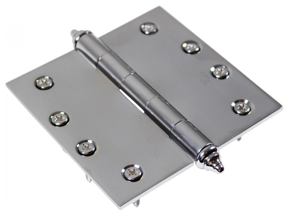 Item 14572 Door Hinges: This chrome-plated Solid Brass Door Hinge measures 4 in. x 4 in. Is solid brass extruded and precision CNC machined. It features 5 barrels, a non-binding stainless steel removable pin and interchangeable finials hinge built to ANSI standards.